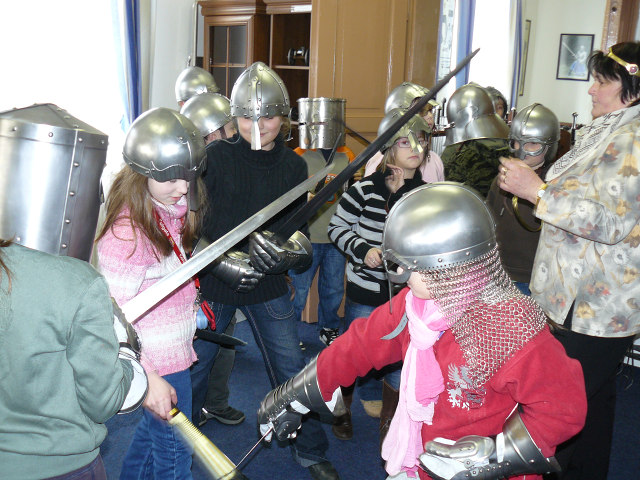 Mohli jsme si vyzkoušet meče, dýky, šavle, halapartny, helmy, štíty, rukavice a palcáty