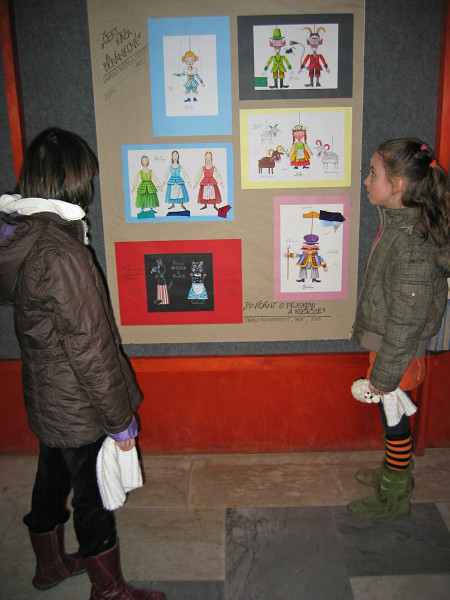 Na výstavě jsme viděli černobílé i barevné návrhy loutek