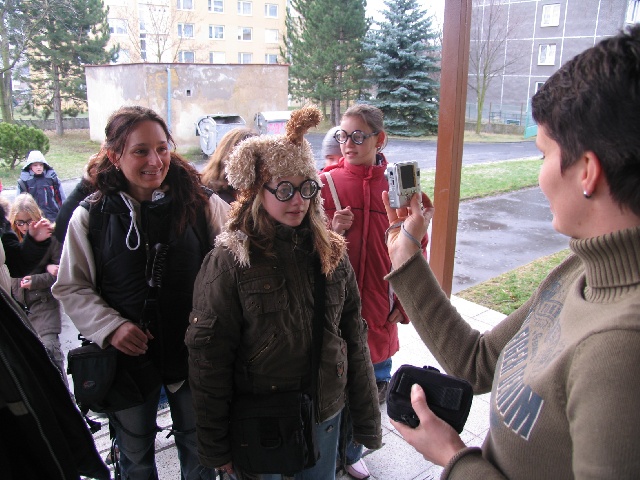 Přišli také "osmáci" ze ZŠ Chomutov, Kadaňská ul. a takhle jsme se s nimi u vchodu k tělocvičnám přivítali.