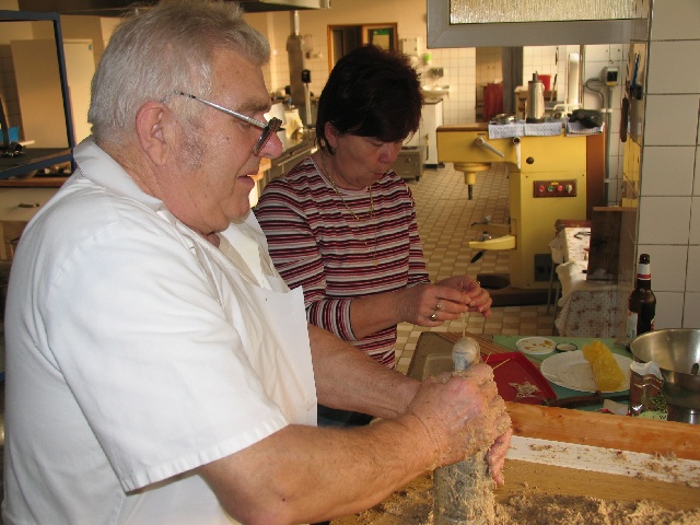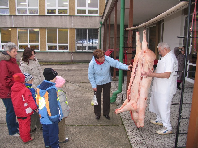 Děti se seznámily s prací řezníka, který připravoval speciality z masopustního pašíka.