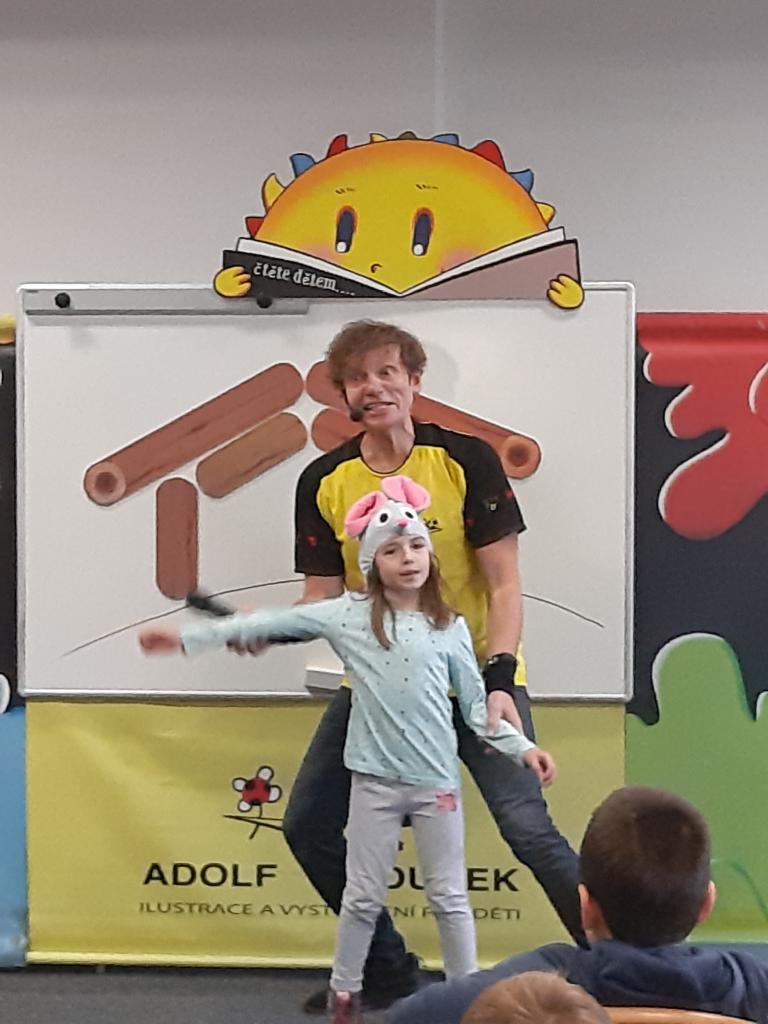 V polovině listopadu se 1.A zúčastnila besedy s velmi skvělým ilustrátorem Adolfem Dudkem.Opět Dudek nezklamal a celou besedu provázel obrovský smích a skvělá nálada.Ilustrátor s oblibou do svých kousků zapojuje nejen děti,ale také učitele.Děti odcházely se spoustou zážitků.