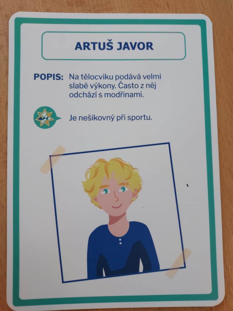 Artuš Javor, to je jméno nového virtuálního kamaráda. Je nešikovný při sportu. Proč je tak nešikovný? Jaké to je být v jeho kůži? Na tyto a další otázky se snažily odpovídat děti ze 2.B prostřednictvím interaktivních her pod vedením zkušené lektorky Věry. Když vše dobře dopadne, bude je tento program, dále pod vedením třídní učitelky, provázet celým školním rokem. Je tu naděje, že děti poznají více nejen svého virtuálního kamaráda Artuše, ale i samy sebe a své spolužáky.