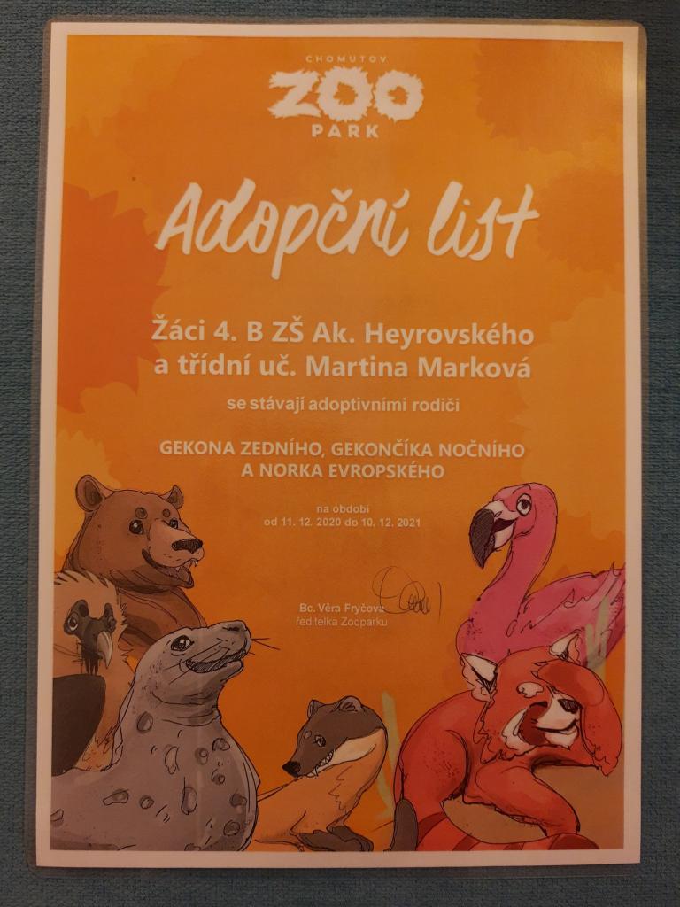 Dnešním dnem jsme se stali adoptivními rodiči tří zvířat v zooparku. Co tomu předcházelo? Souhlas dětí s adopcí, třídní sbírka(Vybrali jsme 3000 Kč. Poděkování za podporu patří i rodičům!), návrhy možností, společná diskuse a konečné hlasování. Volba nebyla jednoduchá, ale nakonec rozhodla většina hlasů a losování. Jaká zvířátka od nás tedy dostala vánoční dárek v podobě ročního příspěvku na péči a krmení? Norek evropský, gekon zední a gekončík noční. Ať se jim celý rok daří! :)