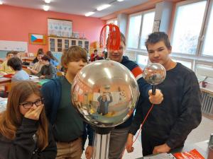 V rámci opakování učiva si žáci 8. ročníků vyzkoušeli novou sadu pro zkoumání elektrostatiky. Děti pracovaly ve skupinách a pozorovaly jak na různé předměty působí elektrostatické pole. To vytvořily pomocí tření tyčí z různých materiálu s kožešinou.