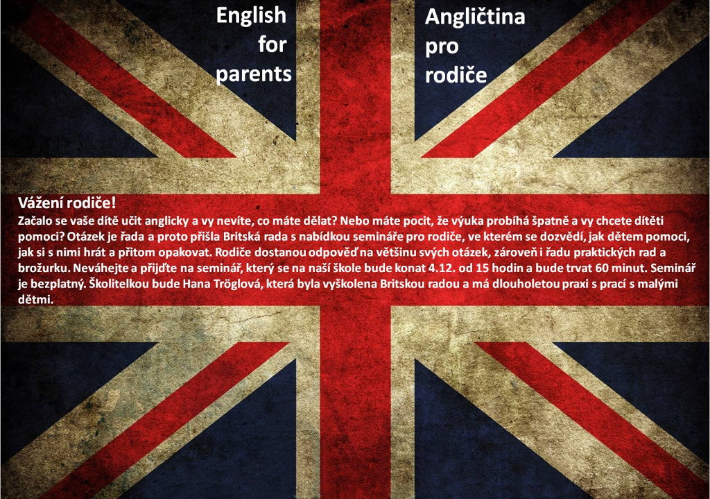 4. 12. 2013 se na naší škole konal bezplatný seminář Britské rady pro rodiče žáků, kteří se začínají učit anglicky. V semináři se dozvěděli, jak dětem pomoci, jak si s nimi hrát a přitom opakovat. Rodiče dostali odpověď na většinu svých otázek, zároveň i řadu praktických rad a brožurku. Školitelkou je Hana Tröglová, která byla vyškolena Britskou radou a má dlouholetou praxi s prací s malými dětmi.