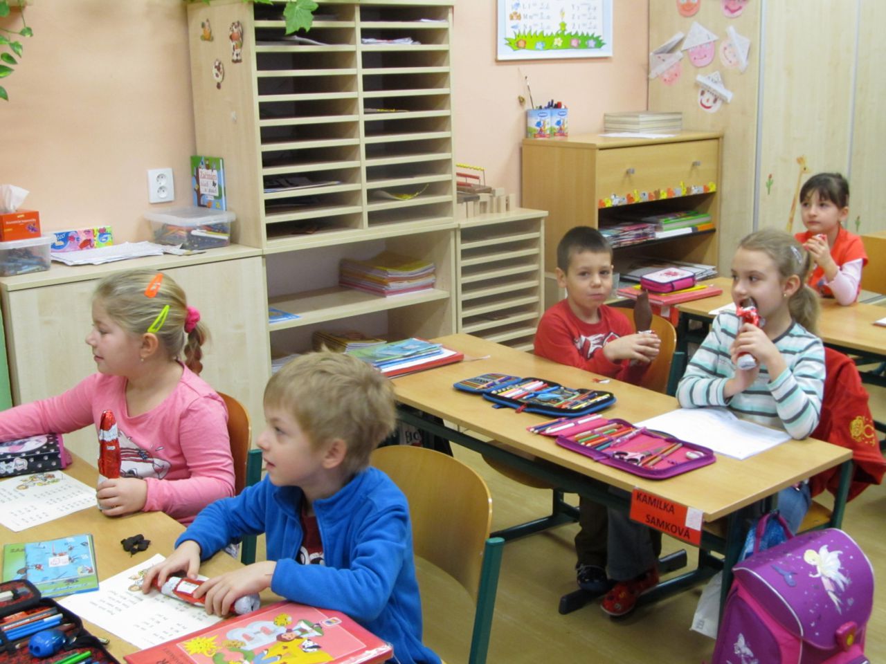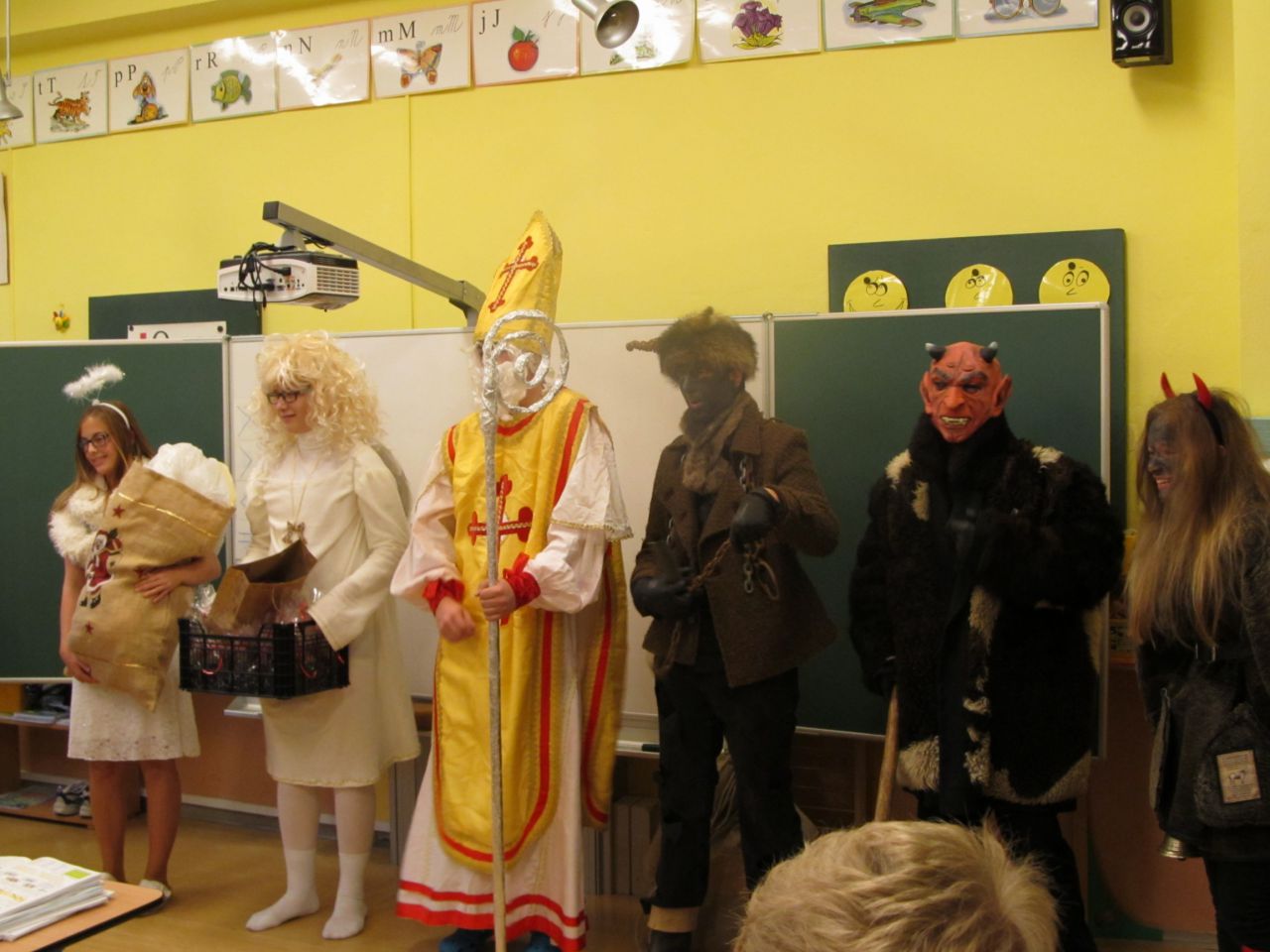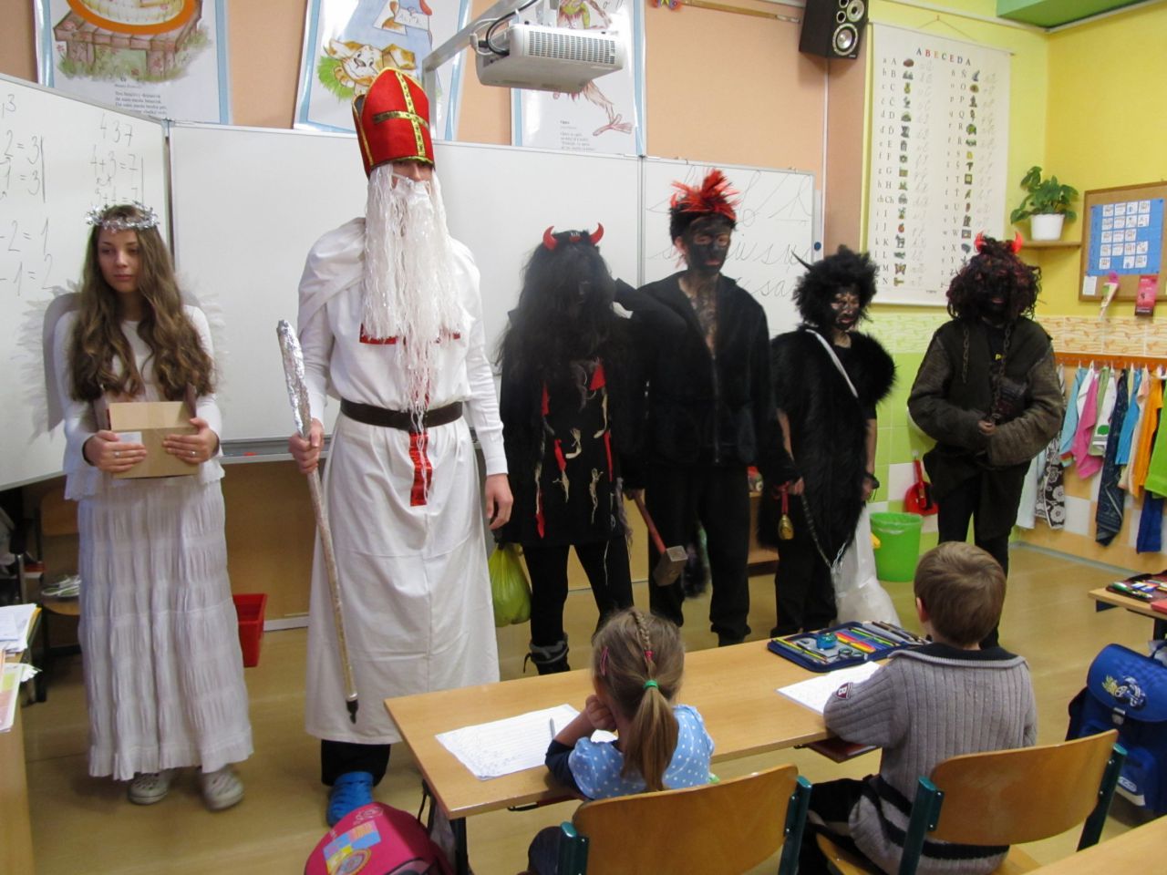 I na naši školu zavítal v pátek 5.12. Čert, Mikuláš a andělé...Zpytovali jsme svá svědomí, přiznávali jsme se ke svým hříchům, ale hlavně jsme slibovali, zpívali, recitovali, četli, počítali a také jsme dostali nějakou tu dobrotu. A protože vše měl pevně ve svých rukách Mikuláš s anděly, čerti neměli šanci, a tak se všechny děti spokojeně vrátily po výuce do svých domovů...