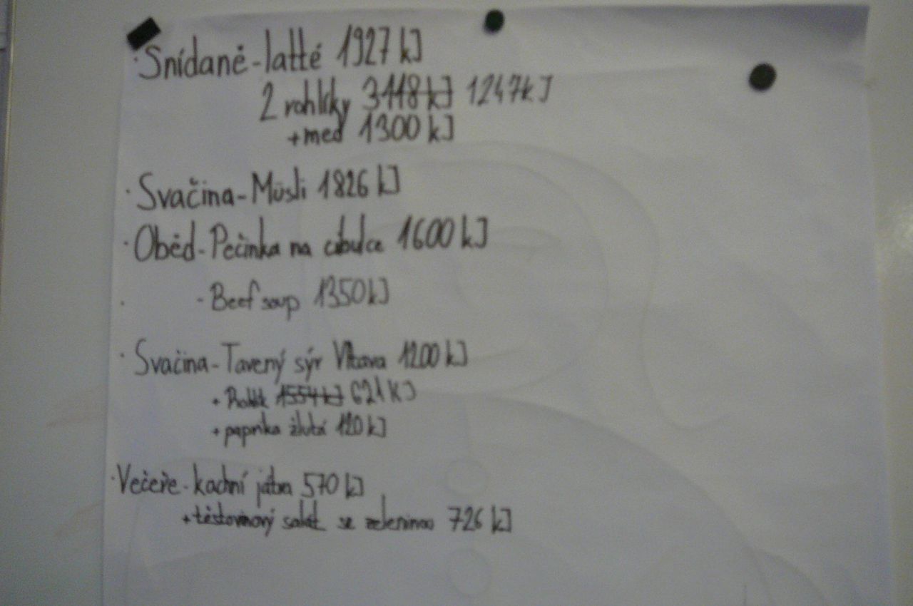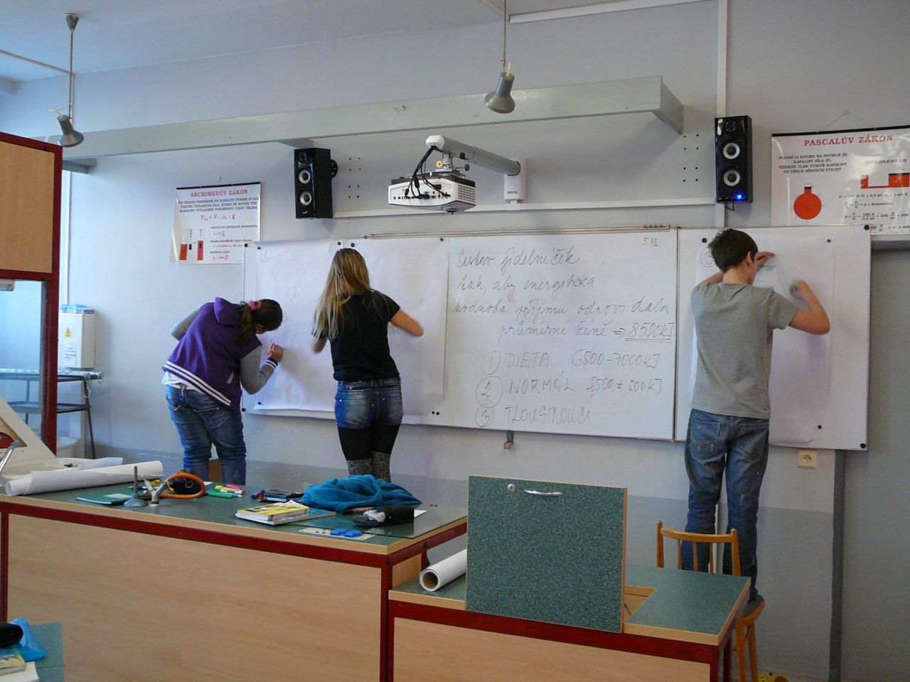 Spojení fyziky s praktickým životem a tím i odpověď na to co spojuje pojmy: „Dieta, energie, fyzika?“ hledali žáci osmých tříd. Stejně tak jako platí ve fyzice zákon zachování energie, tak zjišťovali, že platí totéž i pro energetický příjem potravin a výdej energie pro naše tělo. Hledali energetické hodnoty jednotlivých potravin na obalech výrobků a také sestavovali jídelníček. Ve skupinách měli sestavit jídelníček vyvážený, s vyšší energetickou hodnotou – tedy tloustnoucí a dietní. Jejich první poznání? Sestavit zdravý jídelníček obsahující i nápoje je pěkná dřina. Zjistili, že nejvíce jim „dal zabrat“ vyvážený jídelníček. A co bylo nového - jouly a kilojouly se dostaly z oblasti fyziky, do každodenního života každého z nás..