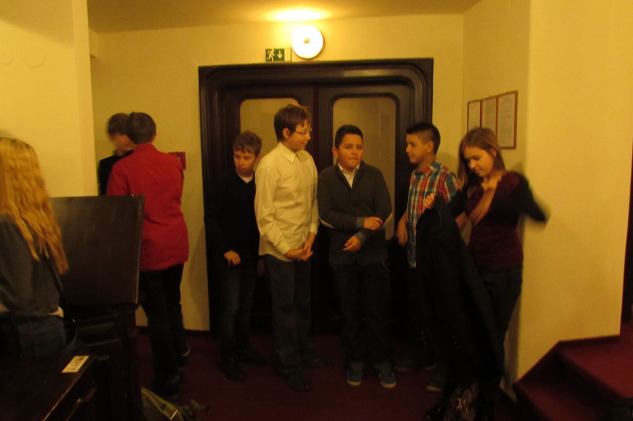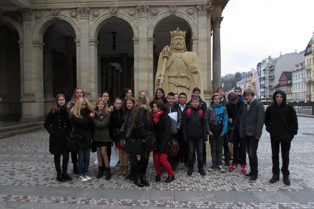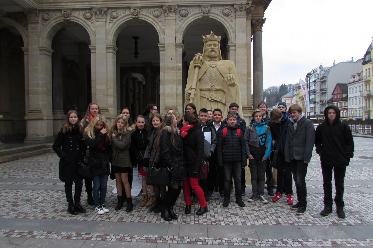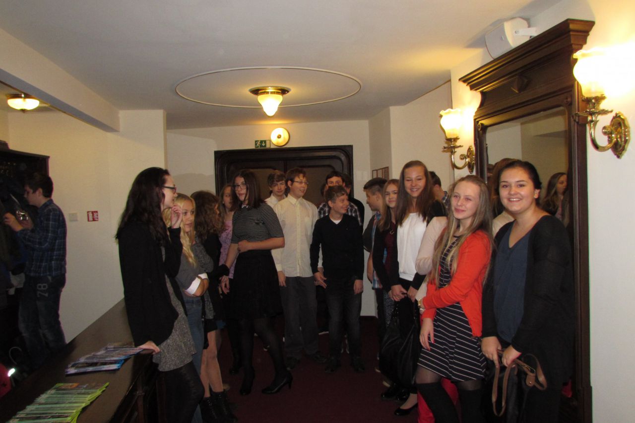 25.11.2016 se konala generální zkouška muzikálu Adéla ještě nevečeřela, na kterou jsme se s 8.b vypravili. Sešli jsme se ráno, všichni krásně oblečení, na vlakovém nádraží. Cesta zimní krajinou je sice smutnější, ale údolí řeky Ohře je pěkné pořád. Vlakem prostě cestujeme rádi. Linka MHD v Karlových Varech jede okružní trasou, ze které je krásný výhled na kolonádu. Budova divadla je krásná. O představení se to bohužel nedalo říci. Zklamání bylo velké. Procházka po kolonádě a společný oběd nám to ale vynahradily. Výlet končil zase vlakem - úspěch zaručen.