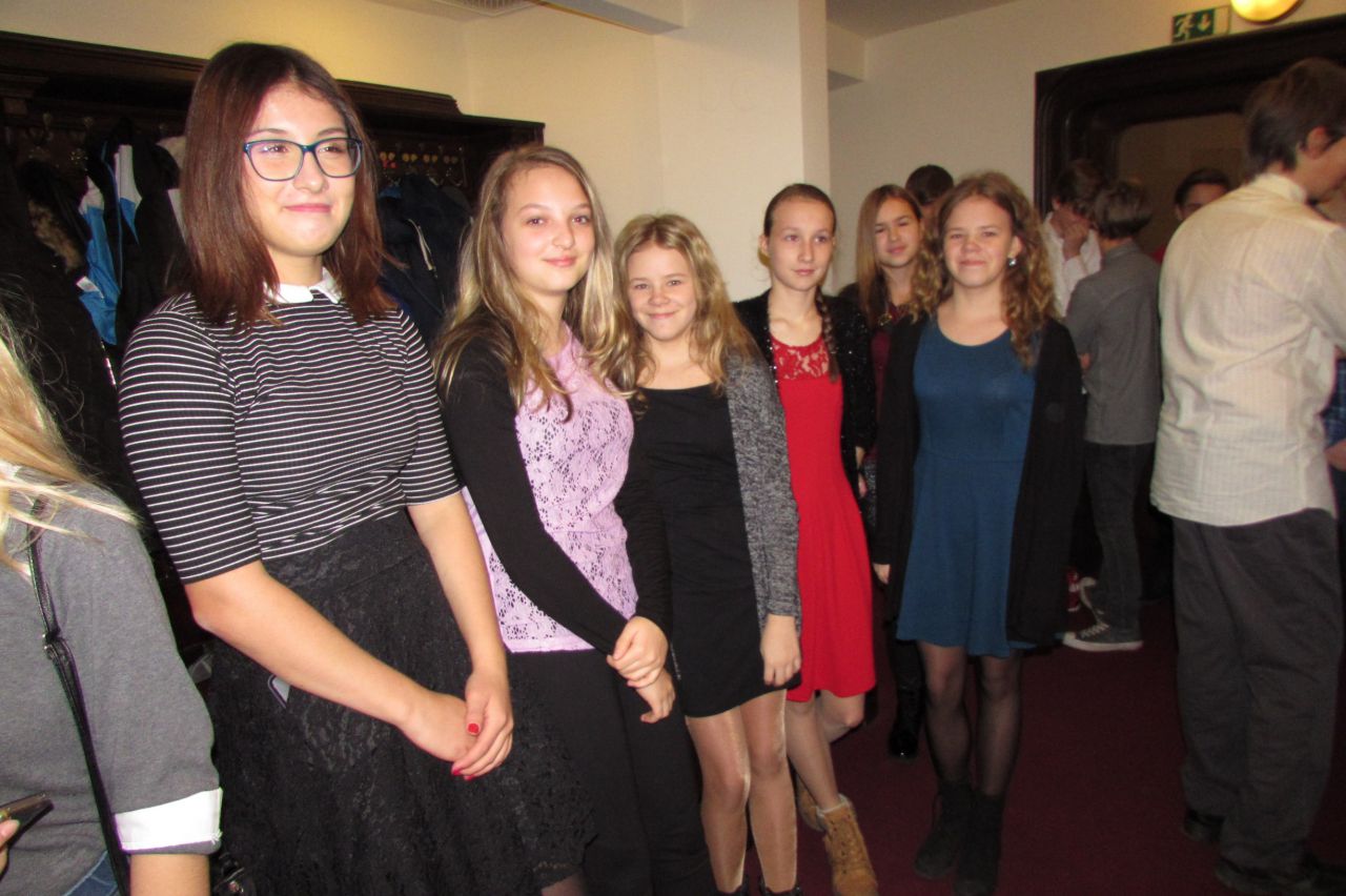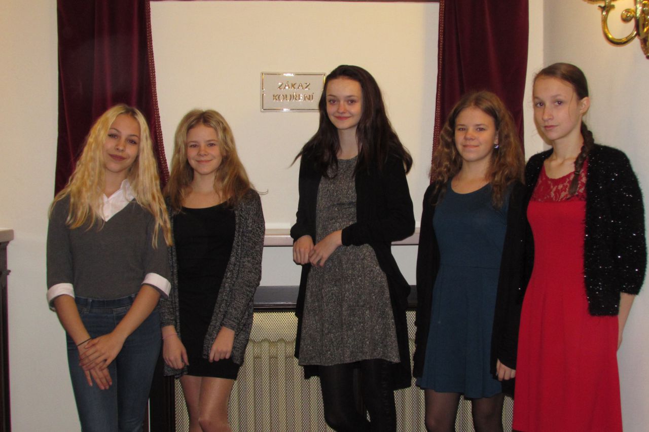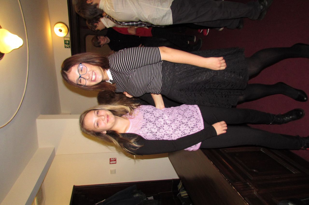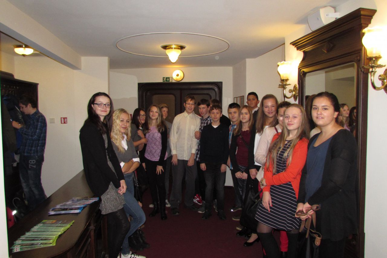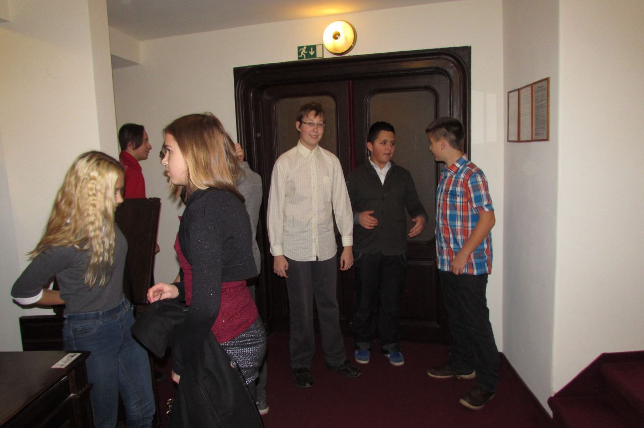 25.11.2016 se konala generální zkouška muzikálu Adéla ještě nevečeřela, na kterou jsme se s 8.b vypravili. Sešli jsme se ráno, všichni krásně oblečení, na vlakovém nádraží. Cesta zimní krajinou je sice smutnější, ale údolí řeky Ohře je pěkné pořád. Vlakem prostě cestujeme rádi. Linka MHD v Karlových Varech jede okružní trasou, ze které je krásný výhled na kolonádu. Budova divadla je krásná. O představení se to bohužel nedalo říci. Zklamání bylo velké. Procházka po kolonádě a společný oběd nám to ale vynahradily. Výlet končil zase vlakem - úspěch zaručen.