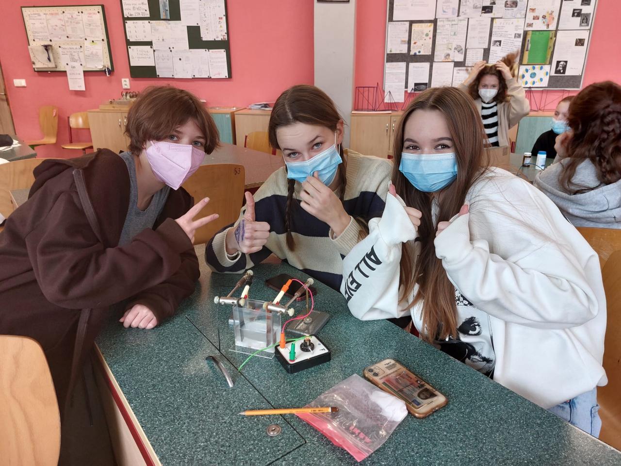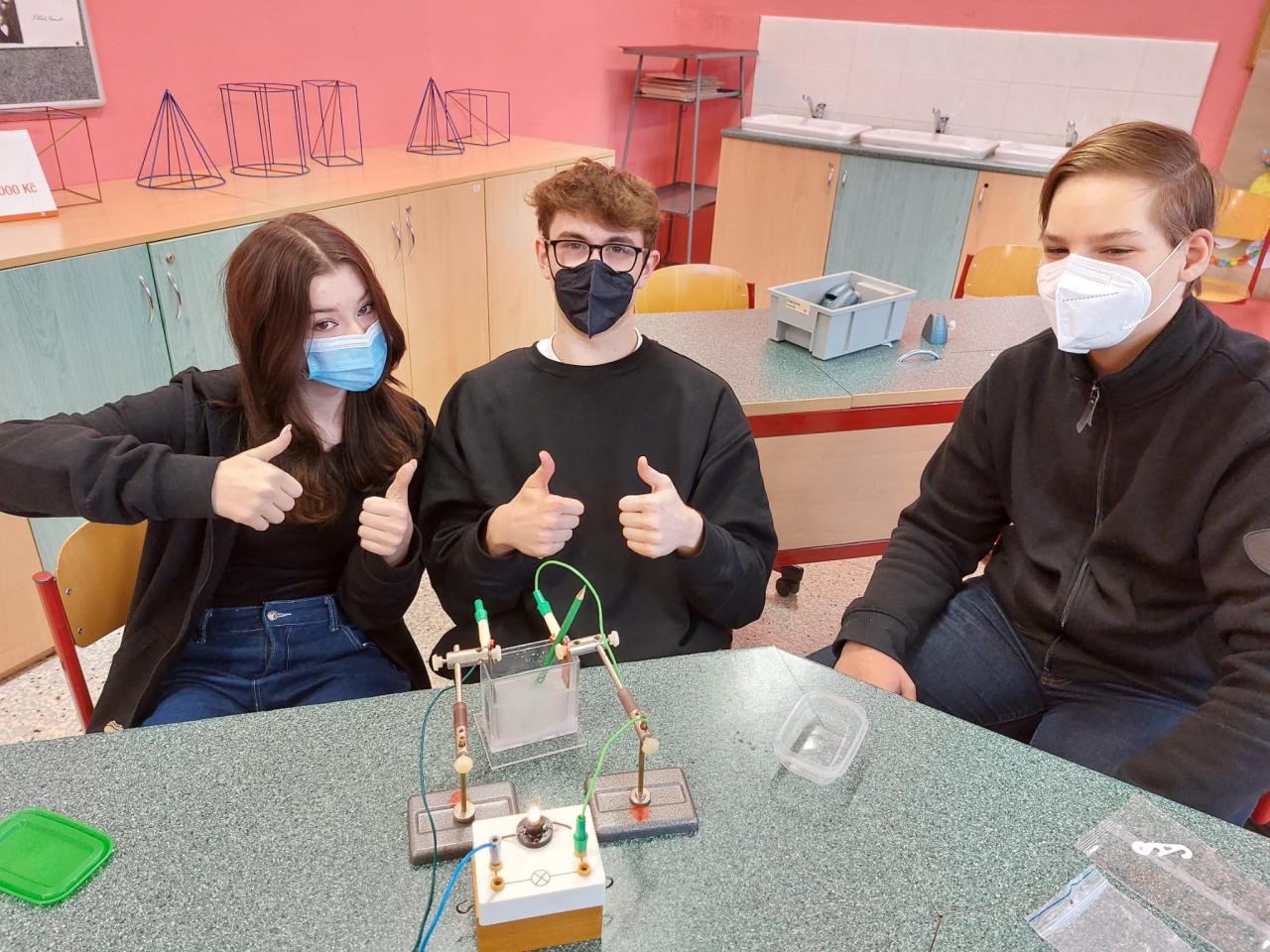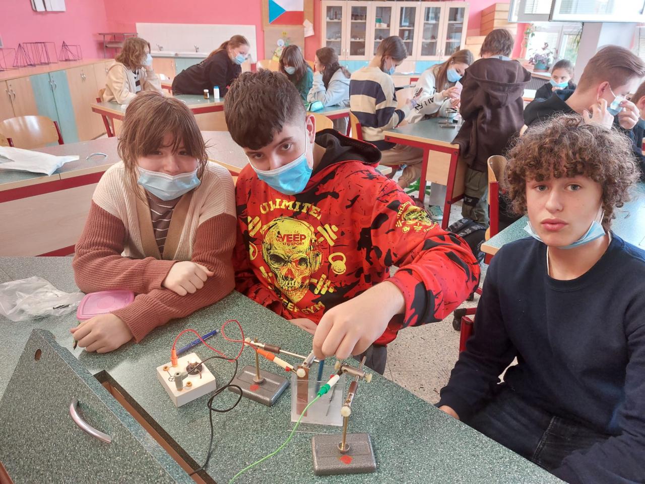 V 9. ročnících si žáci ověřili vedení elektrického proudu v roztoku NaCl. Čím vyšší koncentrace roztoku byla, tím více žárovka svítila.