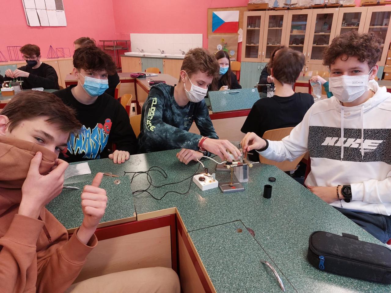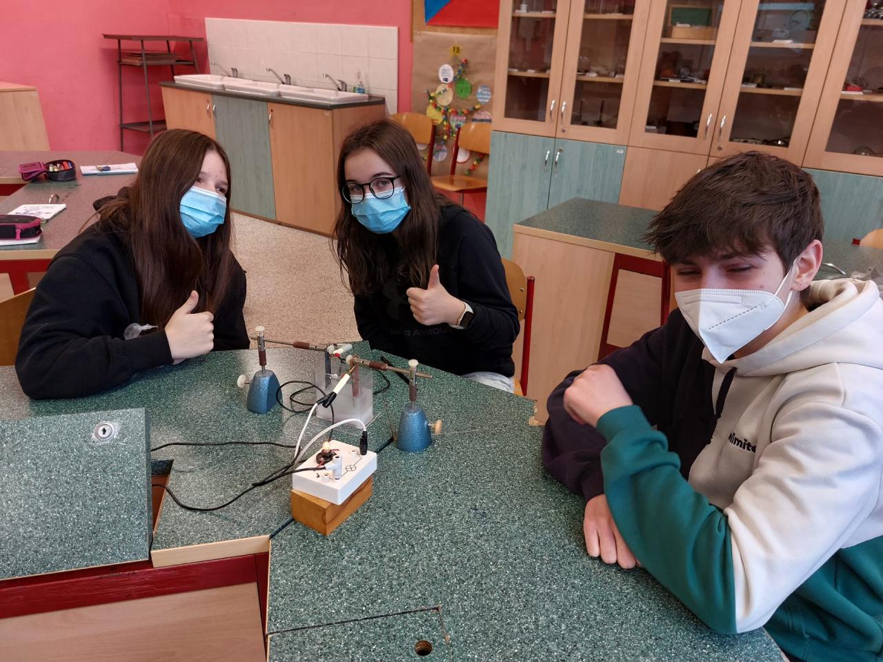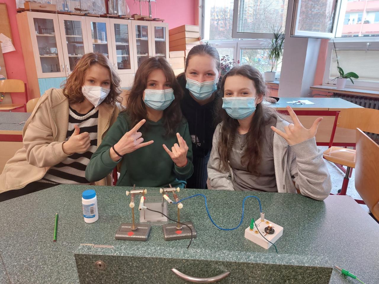 V 9. ročnících si žáci ověřili vedení elektrického proudu v roztoku NaCl. Čím vyšší koncentrace roztoku byla, tím více žárovka svítila.