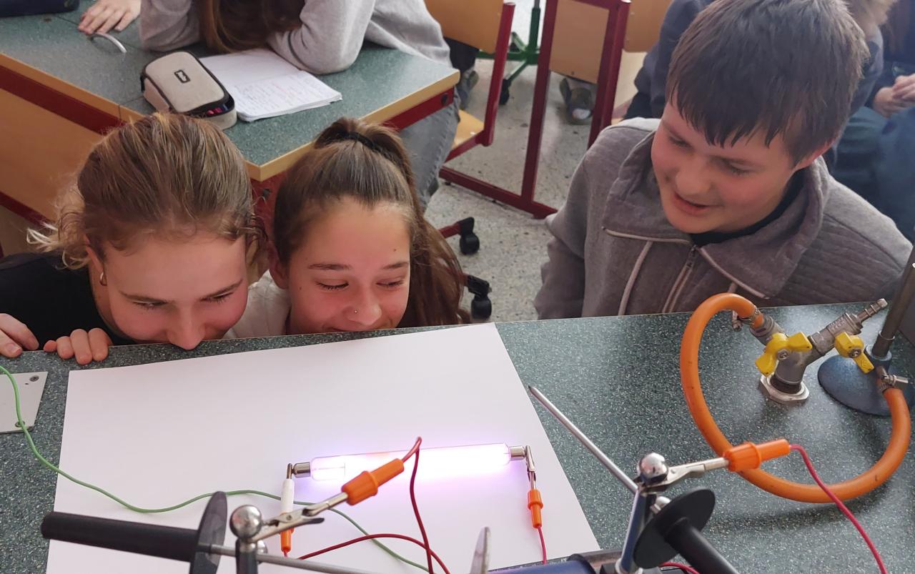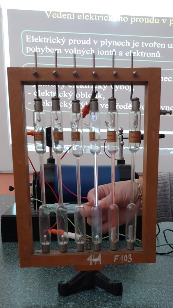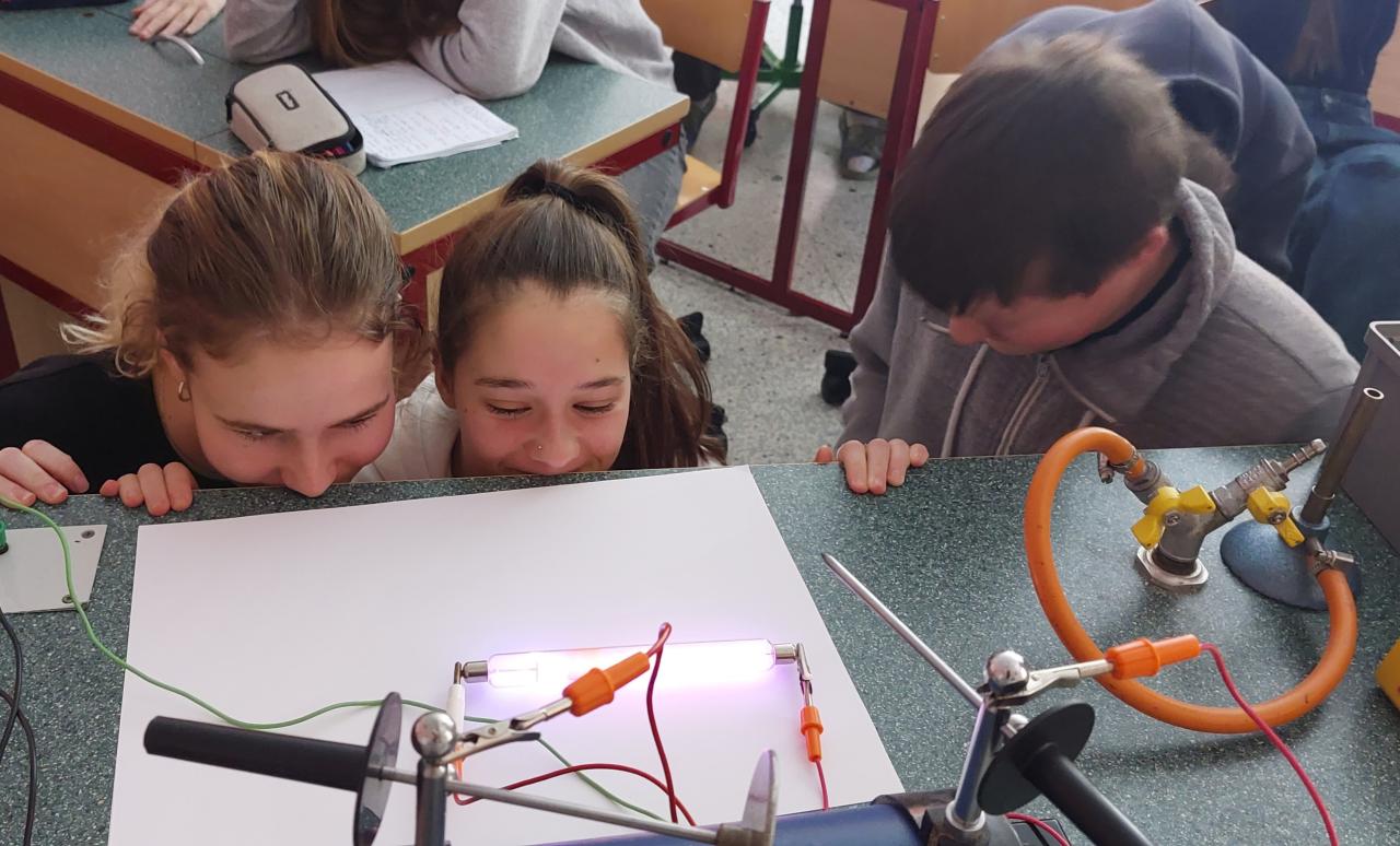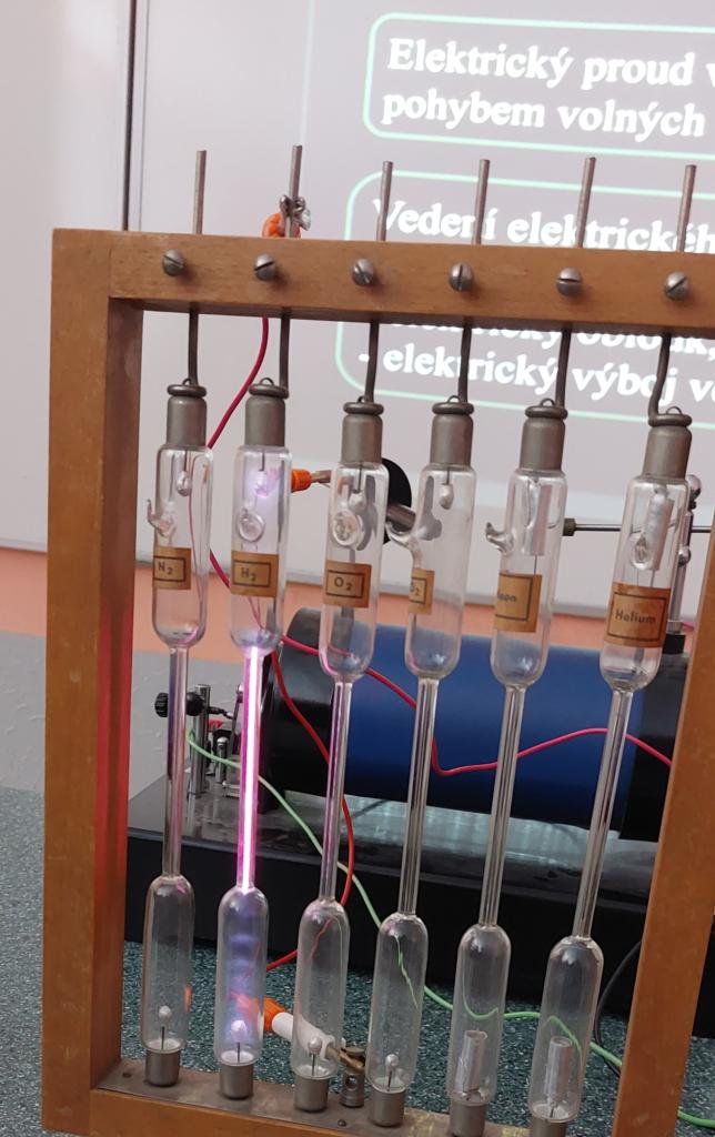 Žáci 9. ročníku zkoumali výboj v plynech při sníženém tlaku - dusík, helium, kyslík, neon, oxid uhličitý, vodík. Dalším experimentem byl doutnavý výboj v plynech, který způsobují srážky iontů s neutrálními molekulami plynu.