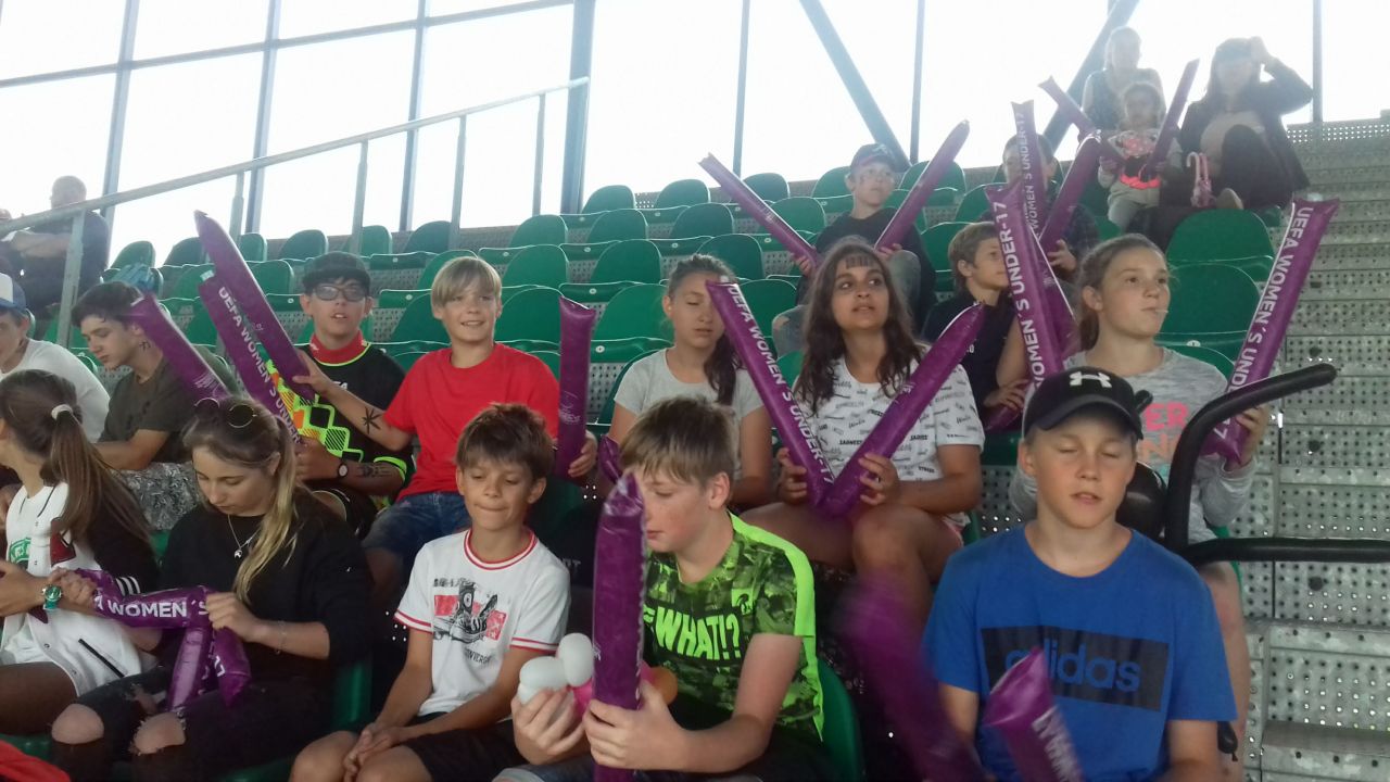 Po skončení akce se většina žáků přesunula na fotbalový stadion, kde našim reprezentantkám vytvořila výborný kotel fanoušků :) a hnali je za vítězstvím.