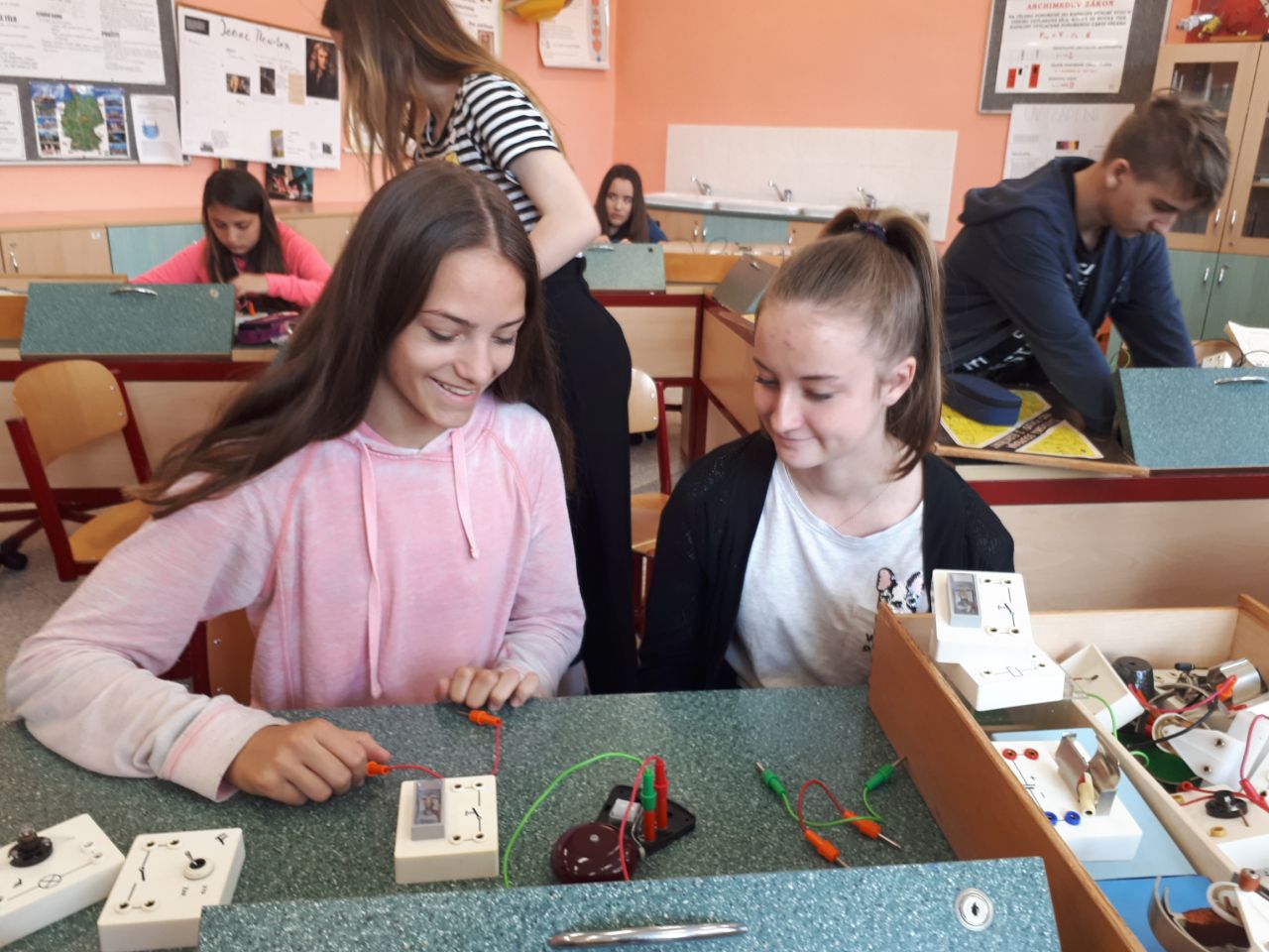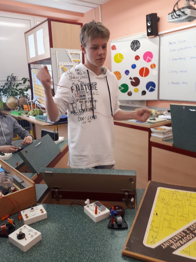 Praktické sestavování elektrických obvodů si vyzkoušeli žáci 8.A. Své teoretické znalosti si ověřovali na fungování el.obvodů v praxi. Začali sestavením jednoduchého el. obvodu, pak si zkoušeli sestavit obvody sériové a paralelní. Radost z práce završil obvod s el. zvonkem, kdy celou třídou drnčeli zvonečky :-).