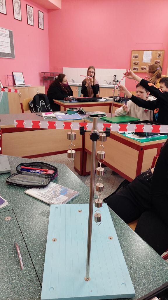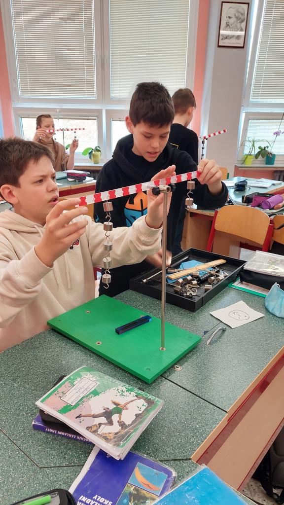 Použití kladky a kladkostroje, nakloněná rovina, páka, tak to bylo cílem praktického cvičení sedmáků ve fyzice. Sestavovali kladkostroji, zkošeli jak kladkostroj " ulehčuje" práci, ve skutečnosti se zmenšuje působící síla. U páky hledali rovnovážnou polohu pro různá ramena s působící síly. Ověřování fyzikálních pravidel si užili :-)