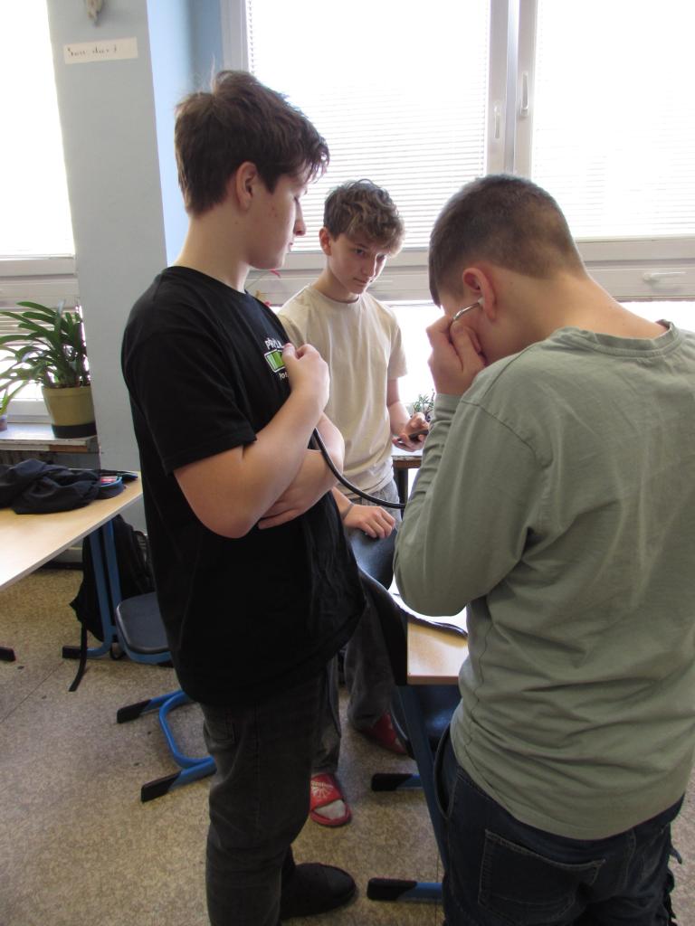 Tlukot srdce zblízka: Díky stetoskopům mohli žáci na vlastní uši slyšet srdeční ozvy – zvuk chlopní v akci.