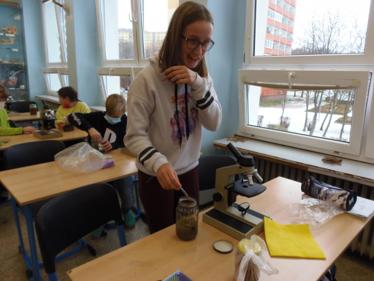 Už dva týdny se doma pečlivě staráme o prvoky v senném nálevu, přišel čas podívat se, jak úspěšní jsme chovatelé. Prvoci jsou malí, nejsou vidět pouhým okem, zvětšovali jsme mikroskopem.