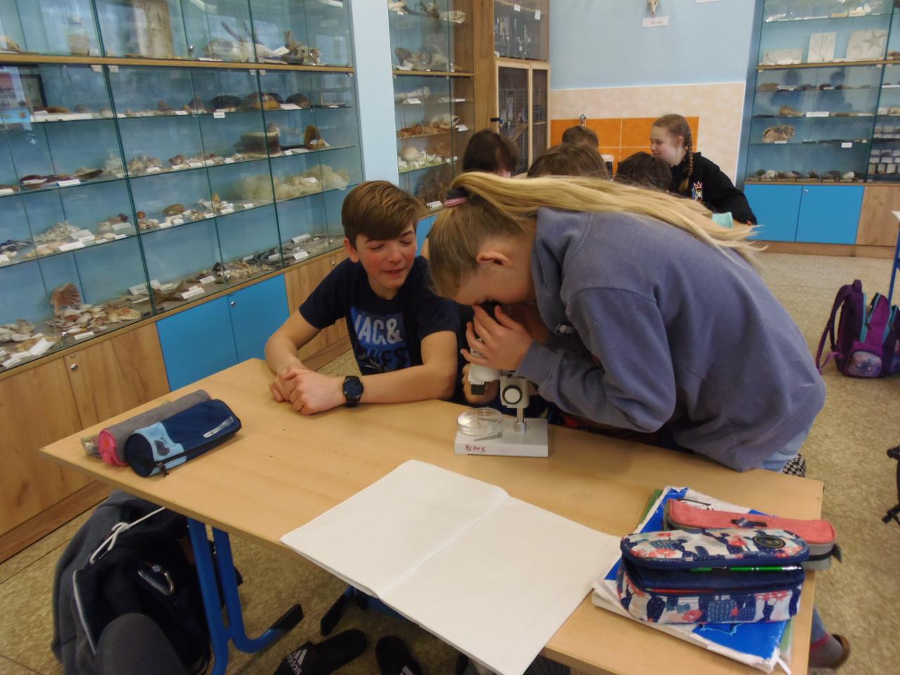 Pozorování pavoučích svleček za pomoci binokulární lupy.