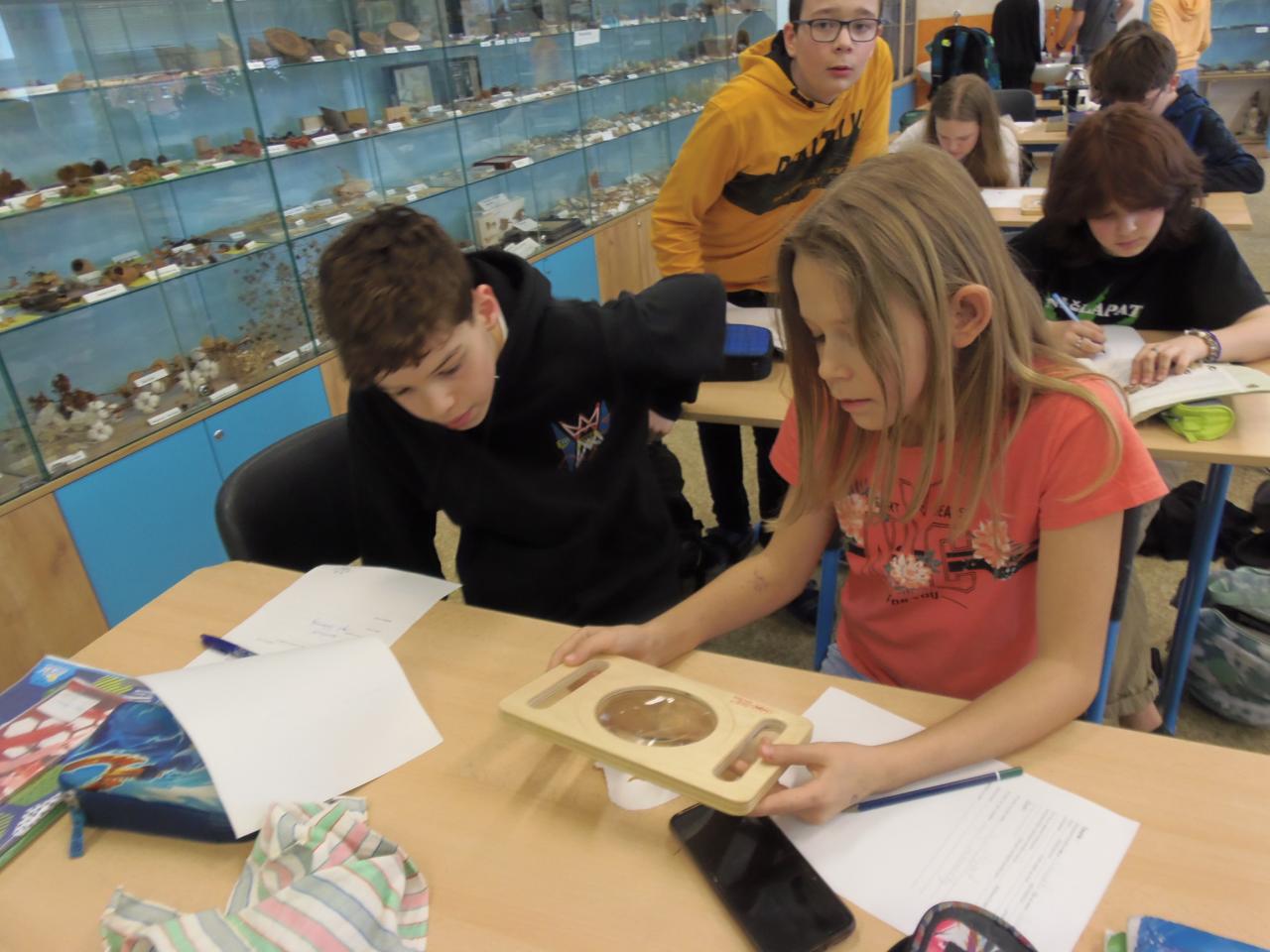 Pozorování vnější stavby těla žábronožky solné pod mikroskopem a Gammaruse za pomoci ruční lupy.