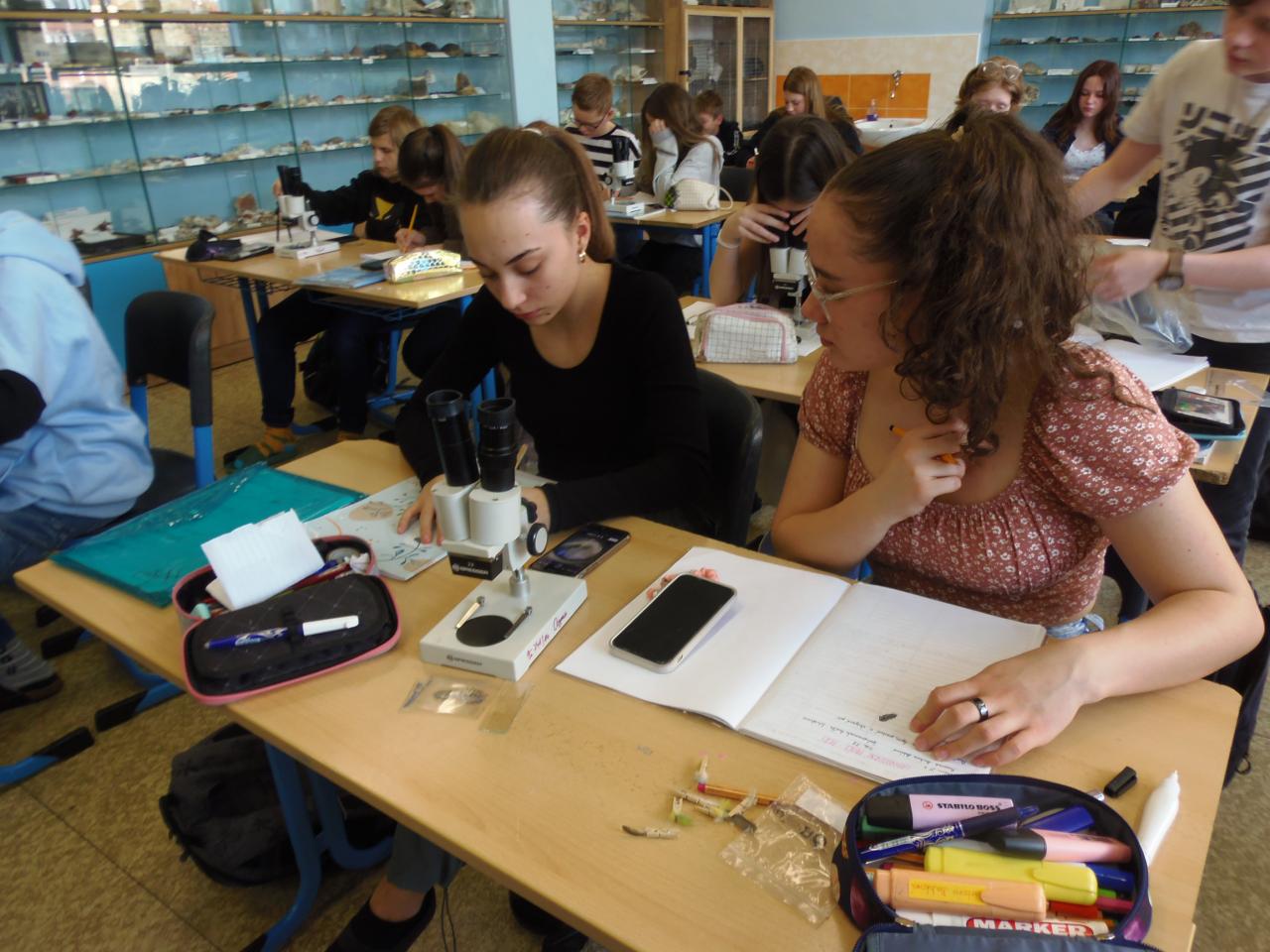 Pozorování ptačího peří za pomoci binokulární lupy.