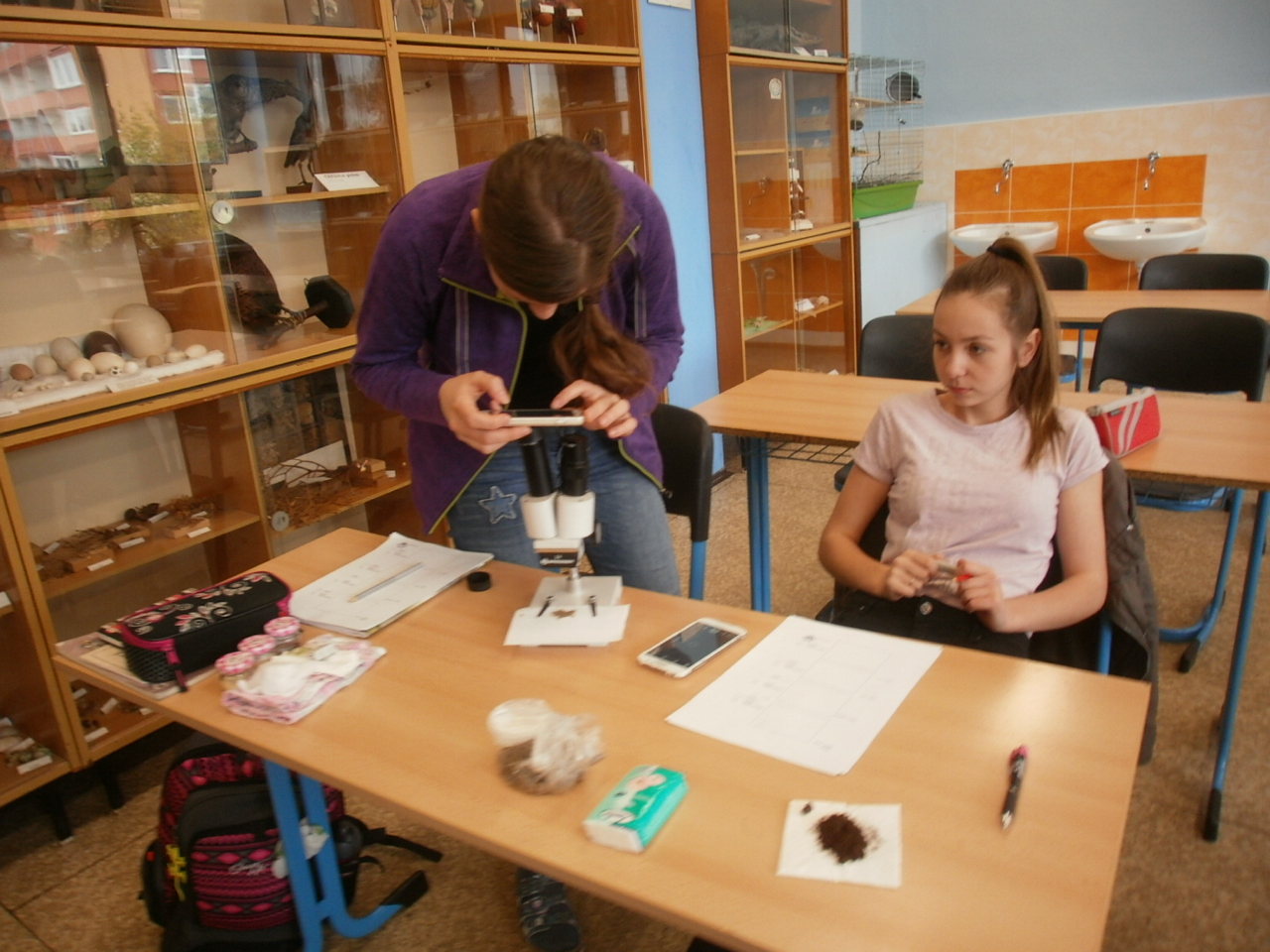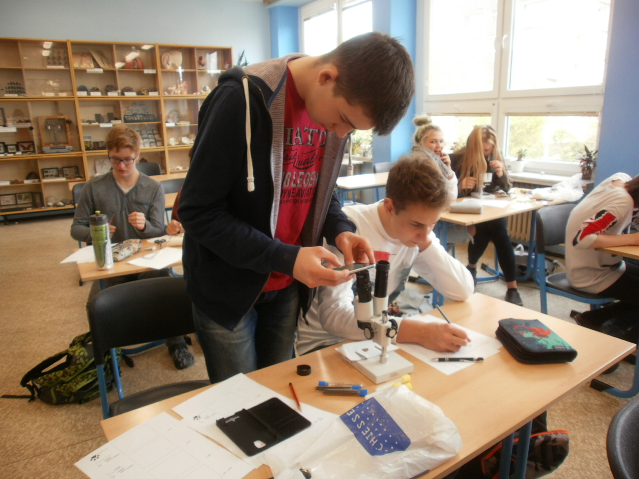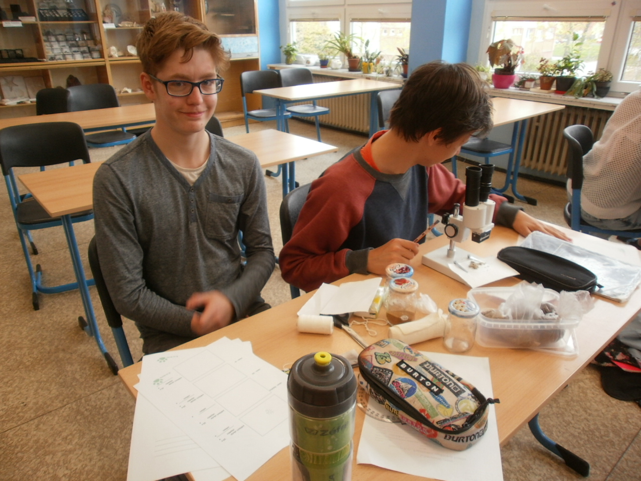 Zkoumání usazených hornin binokulární lupou.