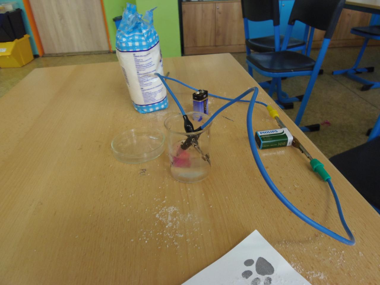 Úkolem práce bylo praktické ověření znalostí z chemie a fyziky. Provedli jsme elektrolýzu roztoku soli a pokoušeli jsme se vymyslet, co se vlastně v kádince děje - které ionty máme a kam putují. Při práci jsme si dali pozor na dodržování bezpečnostních pravidel