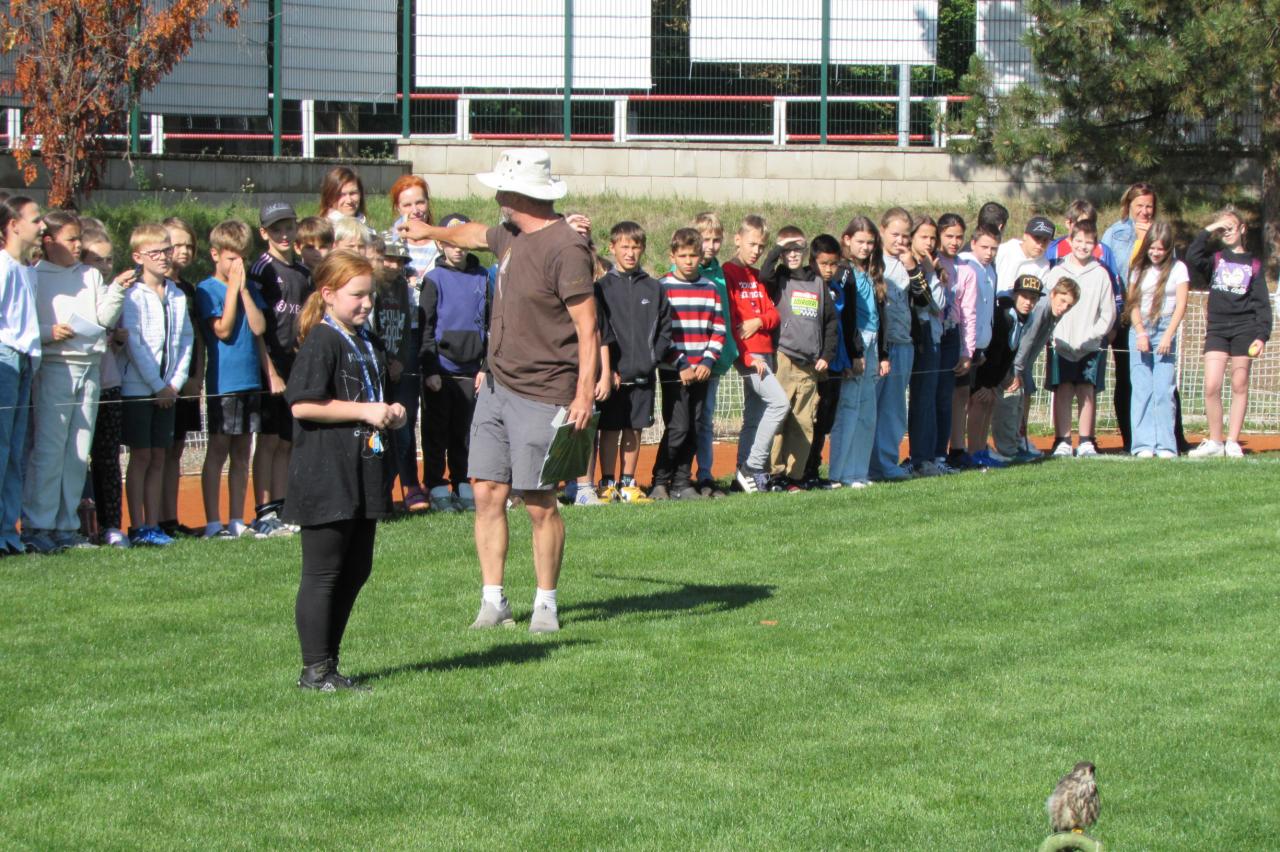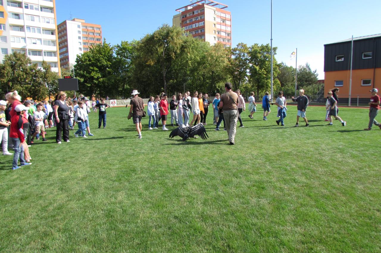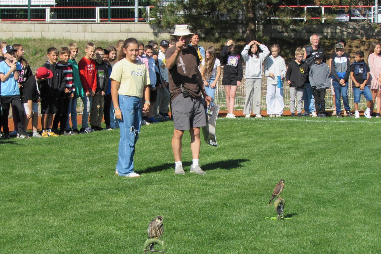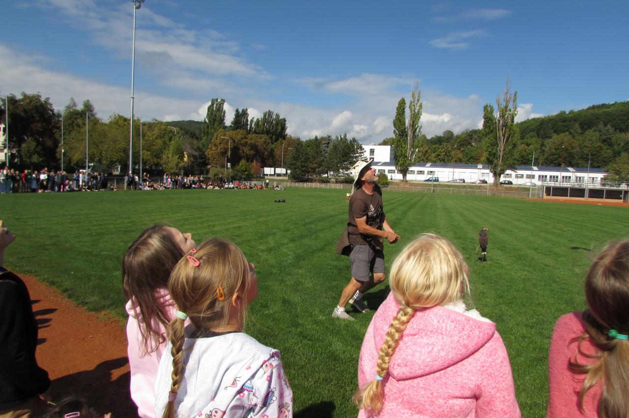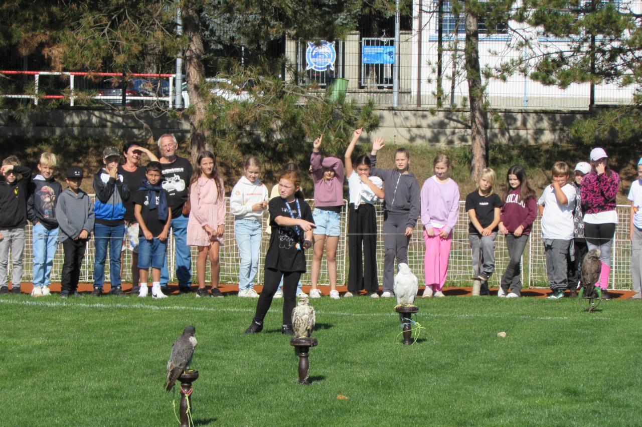 Pro žáky 2.–6. ročníku jsme dnes připravili krásnou akci, která se odehrála na hřišti za školou. Zavítala k nám společnost Zayferus, jež se specializuje na chov a ochranu dravých ptáků, a připravila pro děti jedinečný program plný poznání i zážitků.