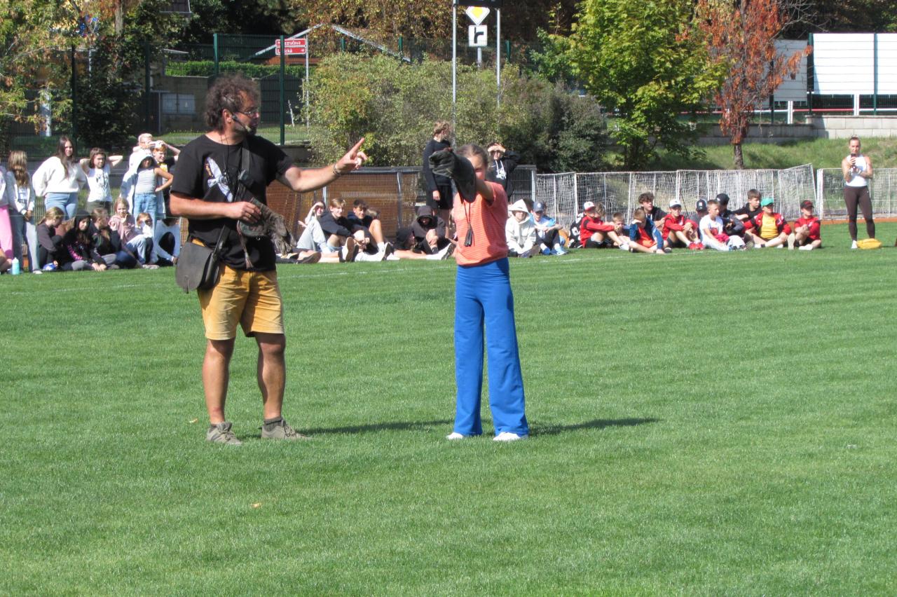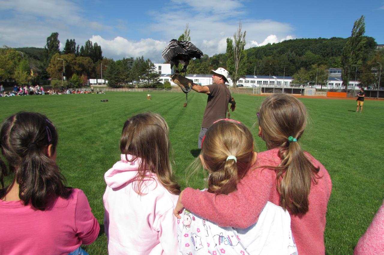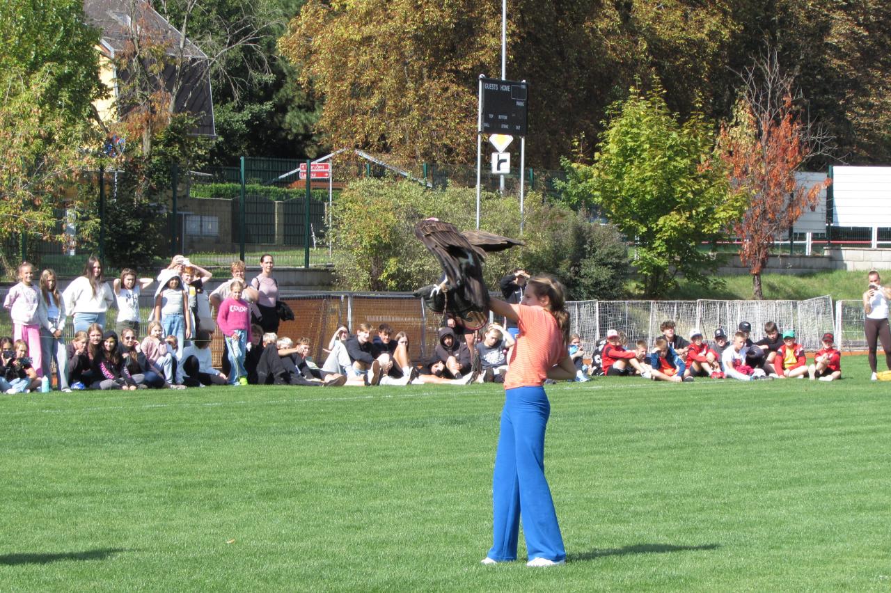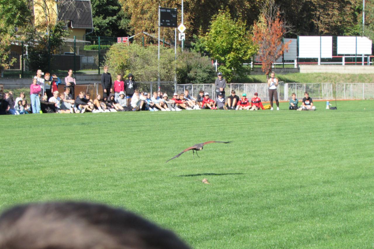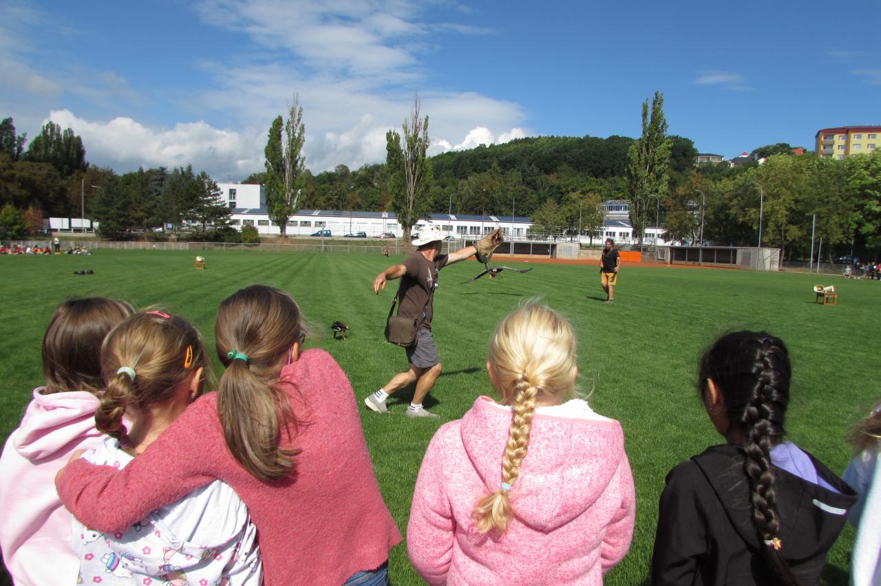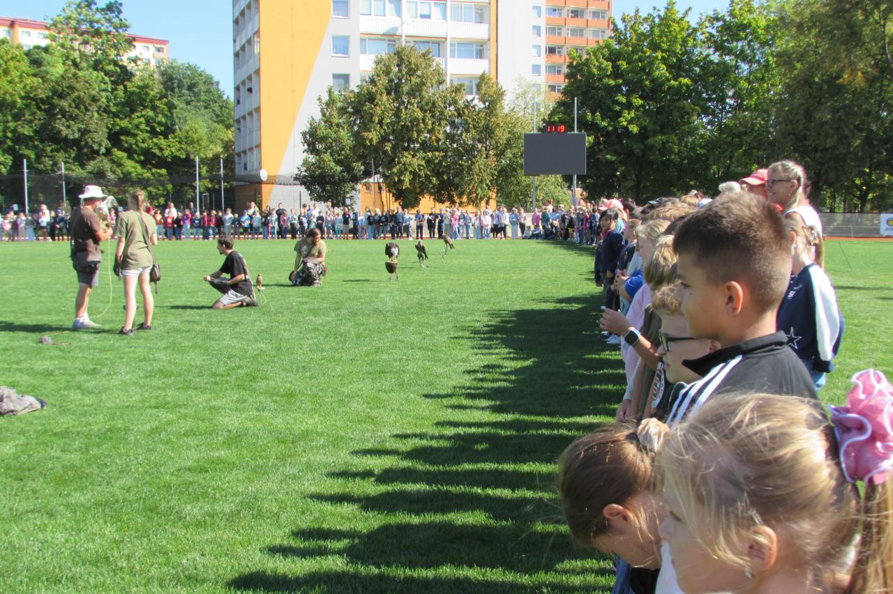 Pro žáky 2.–6. ročníku jsme dnes připravili krásnou akci, která se odehrála na hřišti za školou. Zavítala k nám společnost Zayferus, jež se specializuje na chov a ochranu dravých ptáků, a připravila pro děti jedinečný program plný poznání i zážitků.