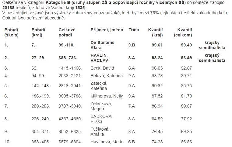 Letošní ročník je zatím nejúspěšnější v dosavadní historii naší účasti, protože hned čtyři žáci prvního stupně postoupili do krajského finále, které se bude konat 1. listopadu v Ústí nad Labem.
