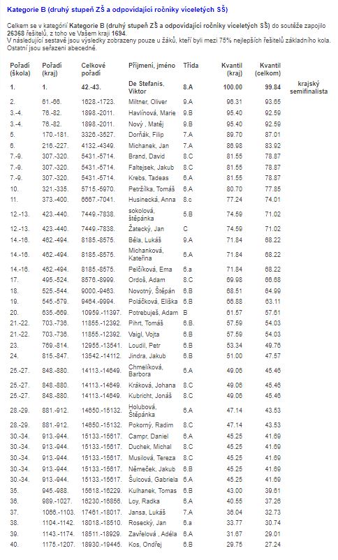 V kategorii B zvítězil Viktor De Stefanis, který postoupil do krajského kola. Oliveru Miltnerovi (61. místo), Marii Havlínové a Matěji Novému (oba 76. místo) unikl postup do krajského kola jen o kousek. V kategorii B soutěžilo 1694 řešitelů z našeho kraje.