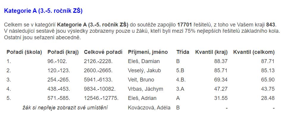 V kategorii A (první stupeň) si nejlépe vedl Damián Eleš (96. místo) a Kuba Veselý (120. místo). Kategorie se celkem zúčastnilo 843 soutěžících z našeho kraje.