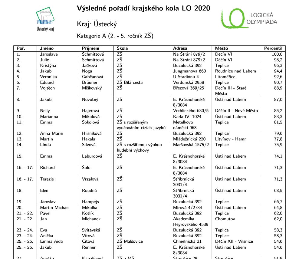 V kategorii A - 2. - 5. ročník reprezentoval naši školu Jan Michanek z 5.A, který se v silné konkurenci také netratil a obsadil 21. místo.