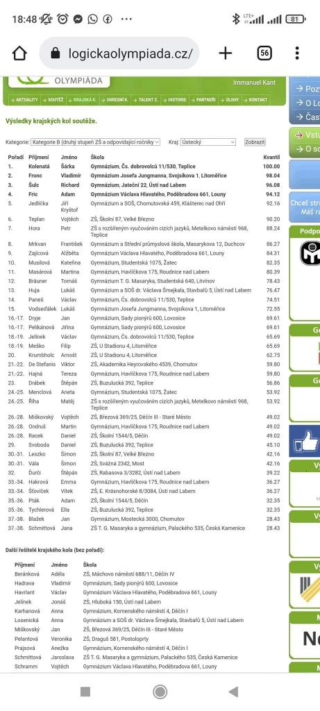 Dne 4. listopadu se konalo v Ústí nad Labem krajské kolo logické olympiády. Z naší školy postoupil v kategorii B do krajského kola Viktor De Stefanis. Jak se mu dařilo?