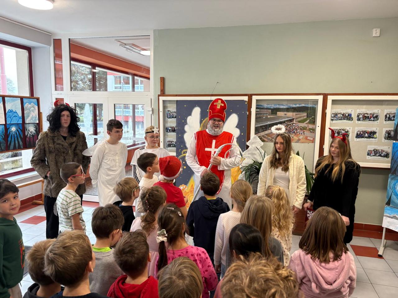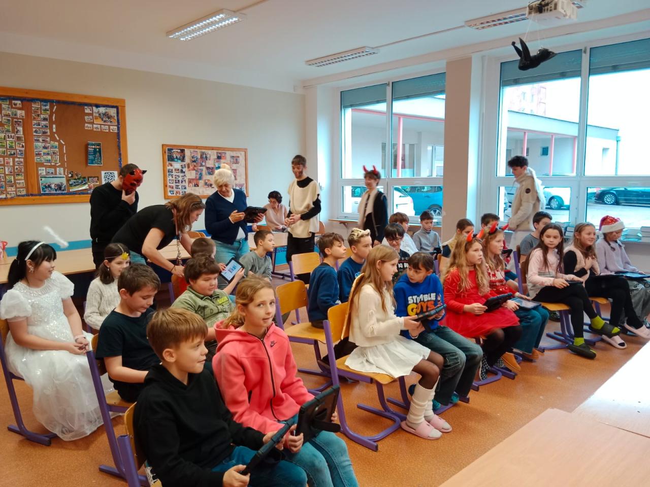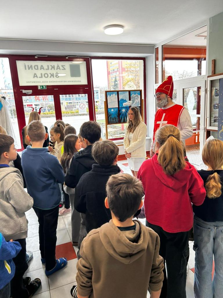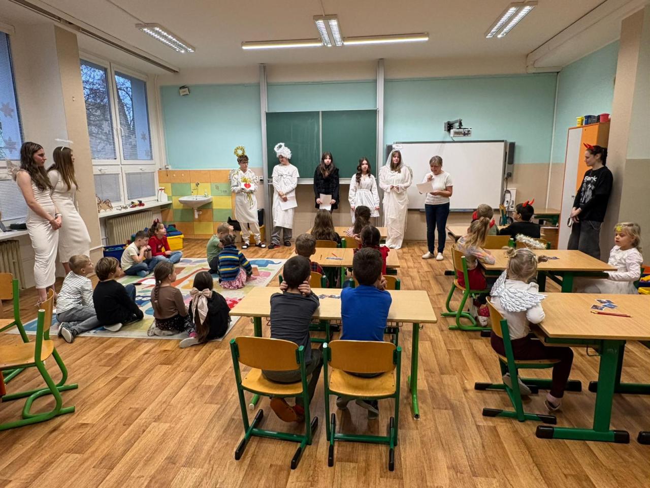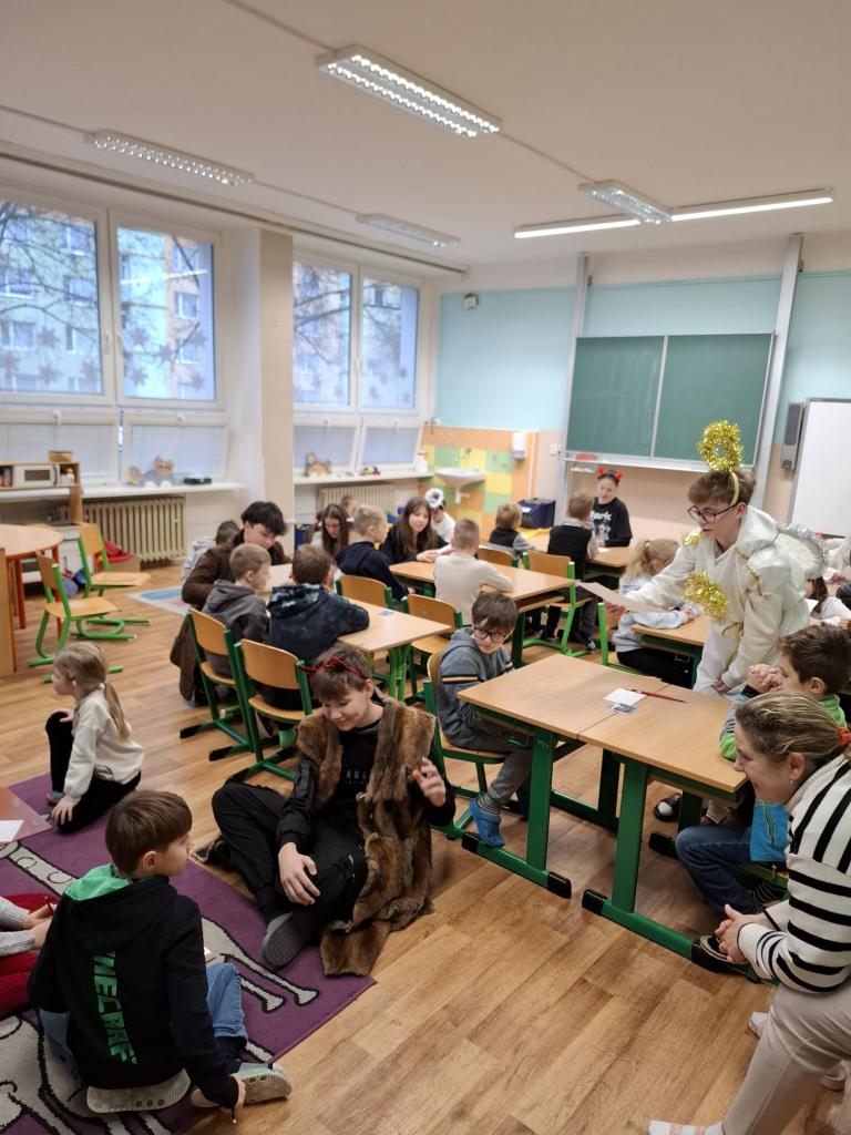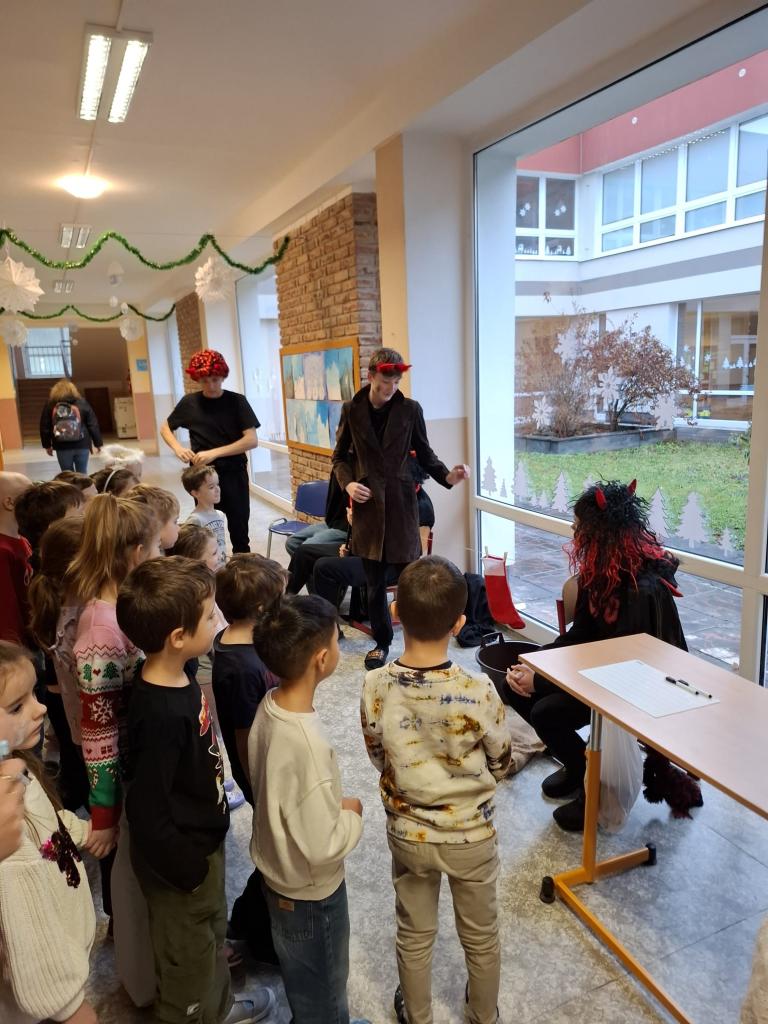 Dnešní Mikulášská akce na prvním stupni proběhla letos v netradičním duchu. Místo obvyklého obcházení tříd s čerty, Mikulášem a anděly jsme se rozhodli pojmout celý den jako kooperativní a zážitkový program, který vychází z principů Začít spolu. Na děti čekala tematická hra Mise Nebe Peklo aneb ztracený seznam svatého Mikuláše, jejímž hlavním cílem bylo rozvíjet spolupráci, empatii, odvahu a ochotu pomoci druhým.
