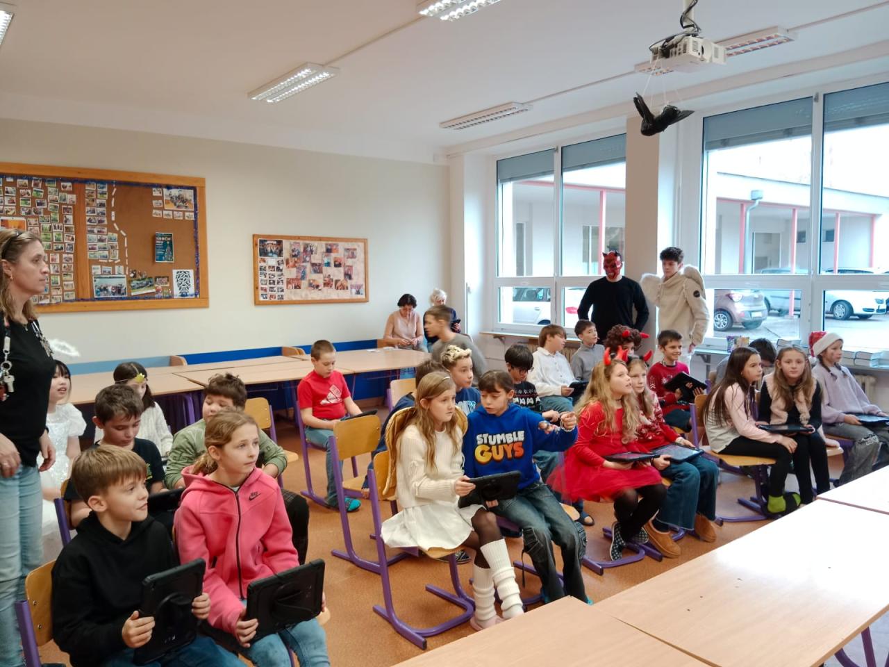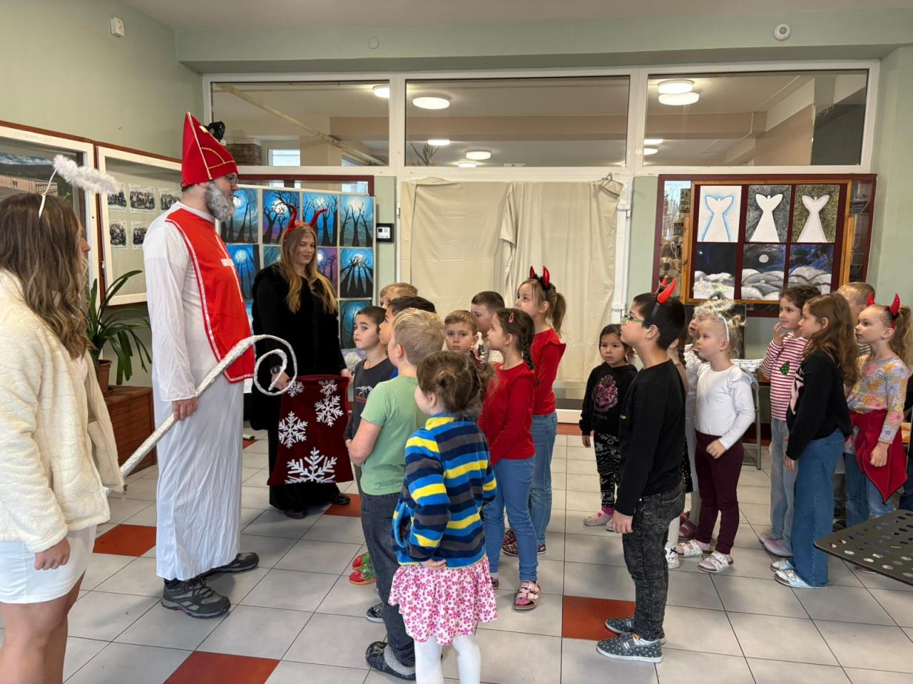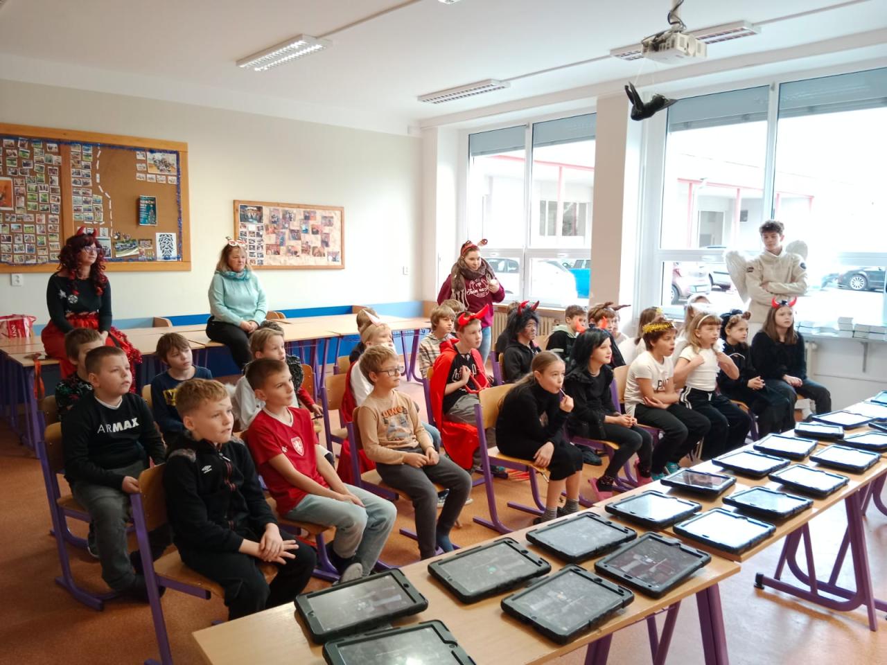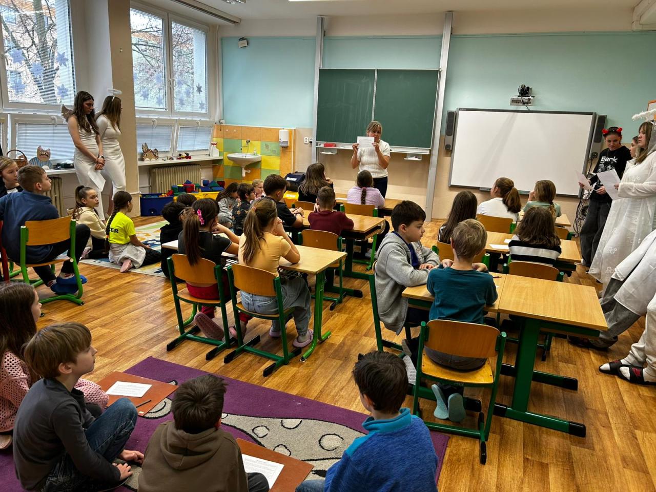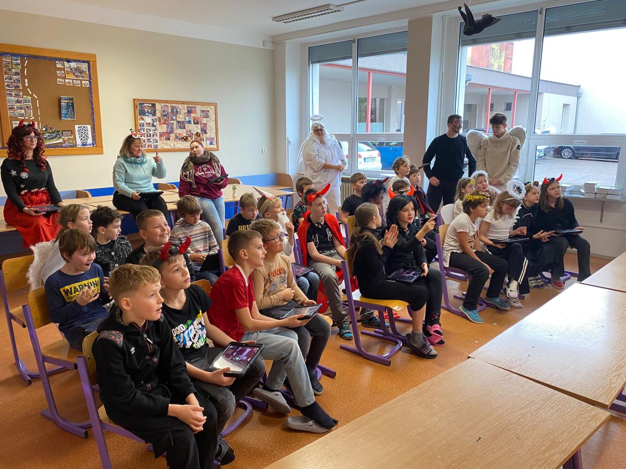Dnešní Mikulášská akce na prvním stupni proběhla letos v netradičním duchu. Místo obvyklého obcházení tříd s čerty, Mikulášem a anděly jsme se rozhodli pojmout celý den jako kooperativní a zážitkový program, který vychází z principů Začít spolu. Na děti čekala tematická hra Mise Nebe Peklo aneb ztracený seznam svatého Mikuláše, jejímž hlavním cílem bylo rozvíjet spolupráci, empatii, odvahu a ochotu pomoci druhým.
