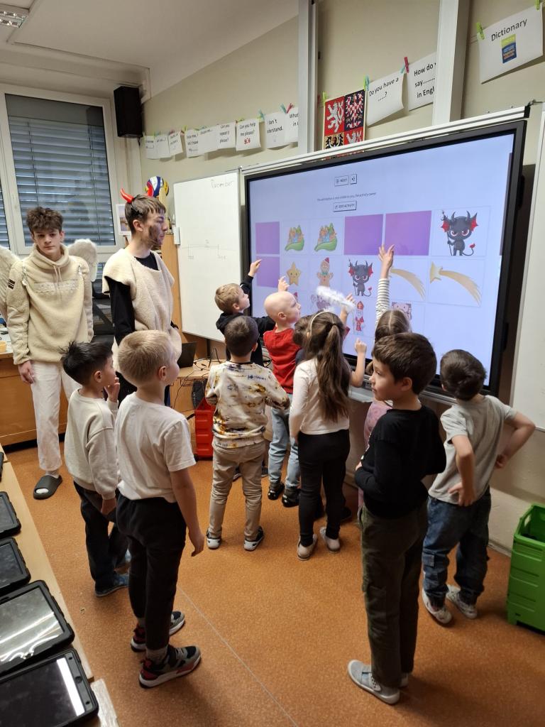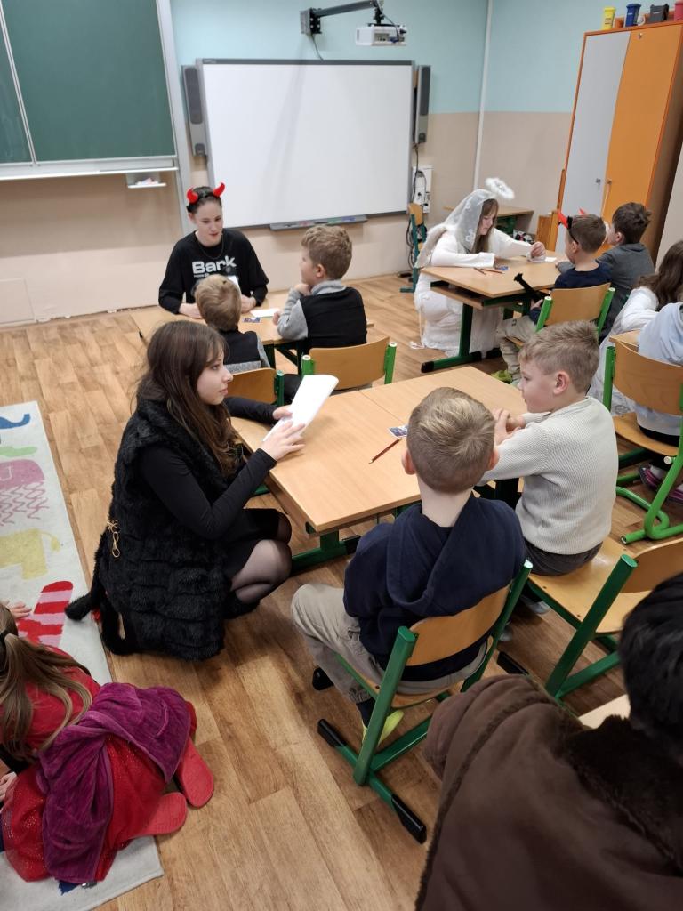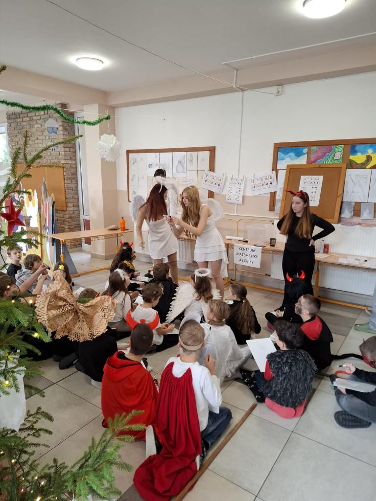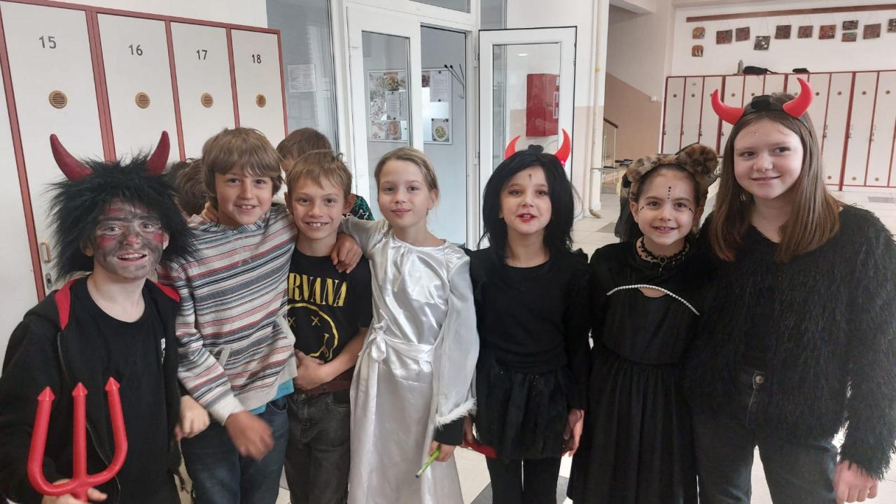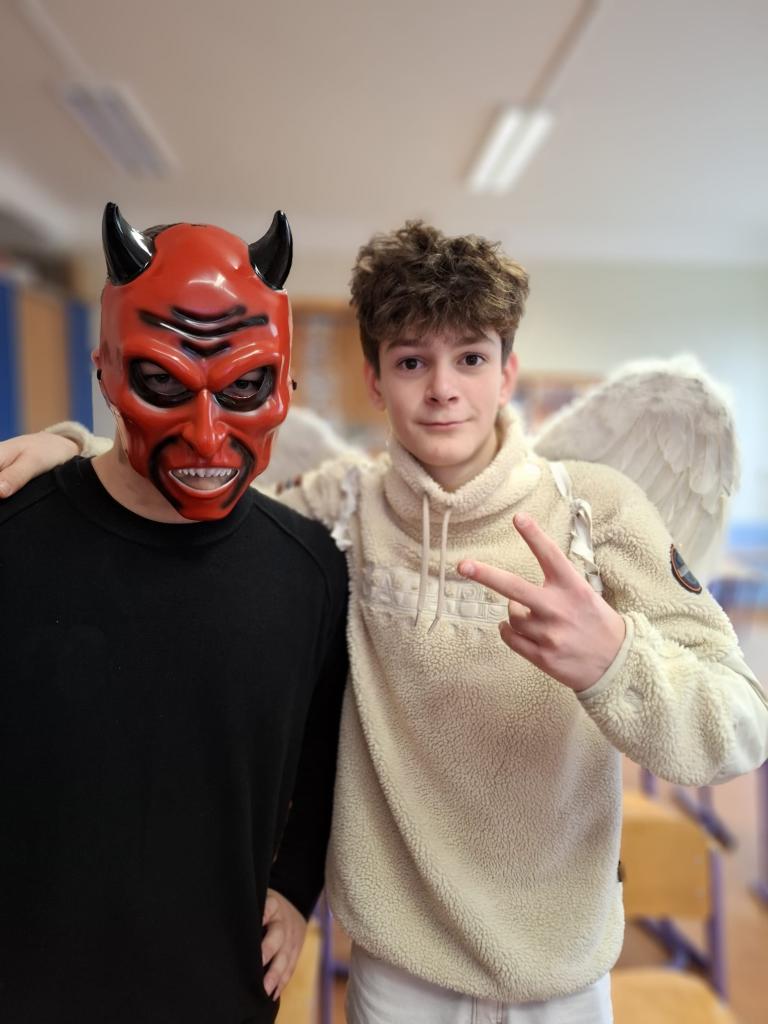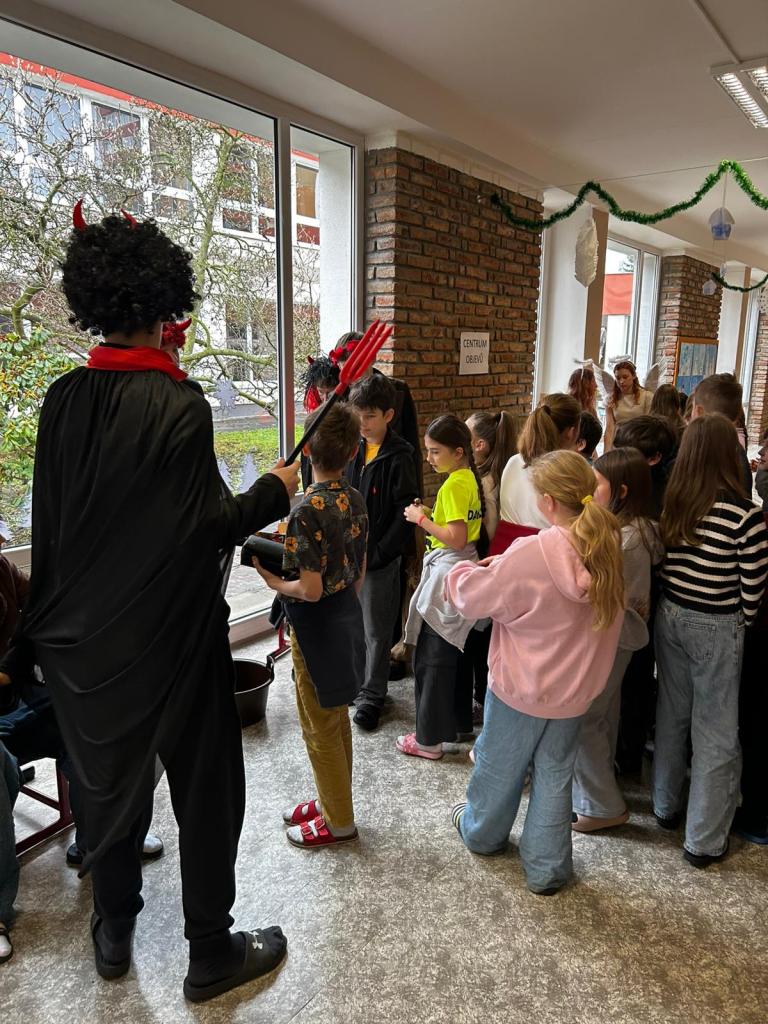 Velkou roli dnes sehráli také naši deváťáci, kteří se ujali rolí čertů a andělů. Nešlo však jen o kostýmy – stali se skutečnými mentory mladších spolužáků. Trpělivě je provázeli jednotlivými stanovišti, pomáhali s úkoly, podporovali je, když si nebyly jisté, a dokázali vytvořit bezpečnou atmosféru, ve které se i ti nejmladší cítili jistě. Jejich obětavost, klid a ochota pomoci byly jedním z nejsilnějších momentů dne.