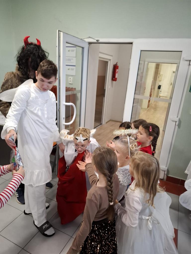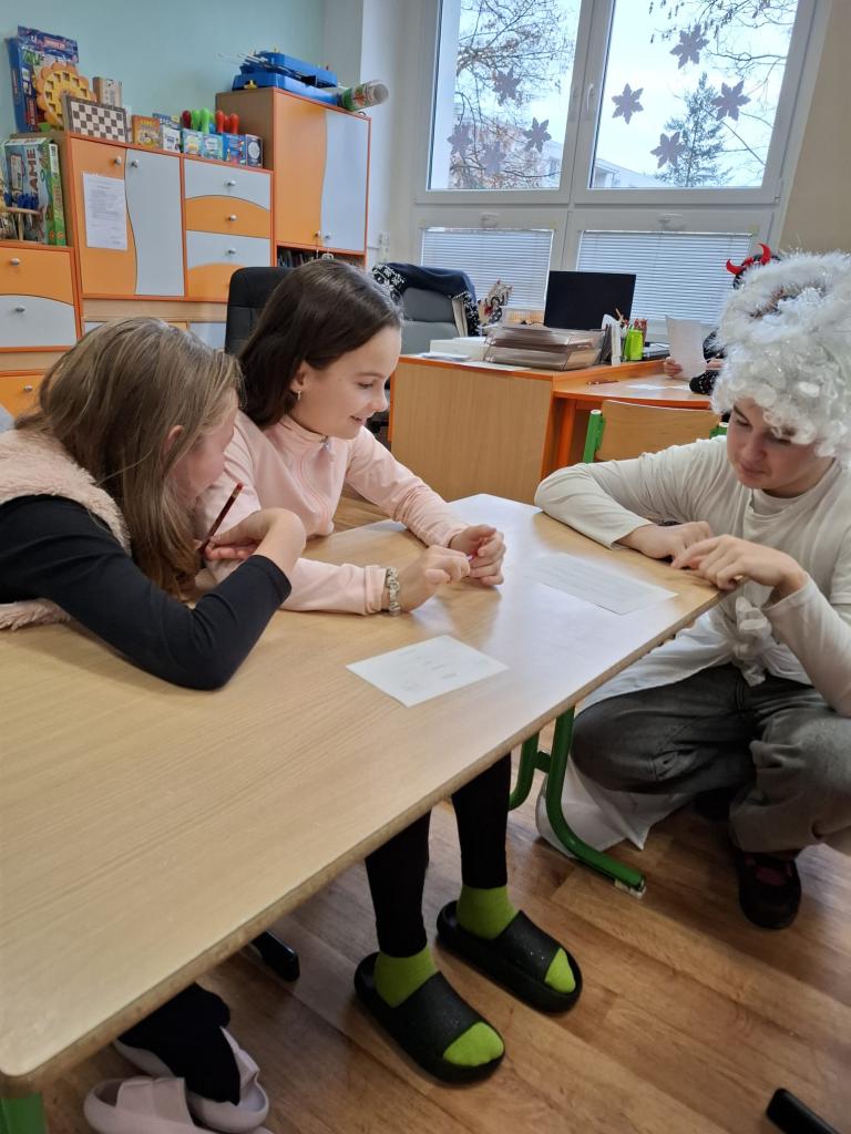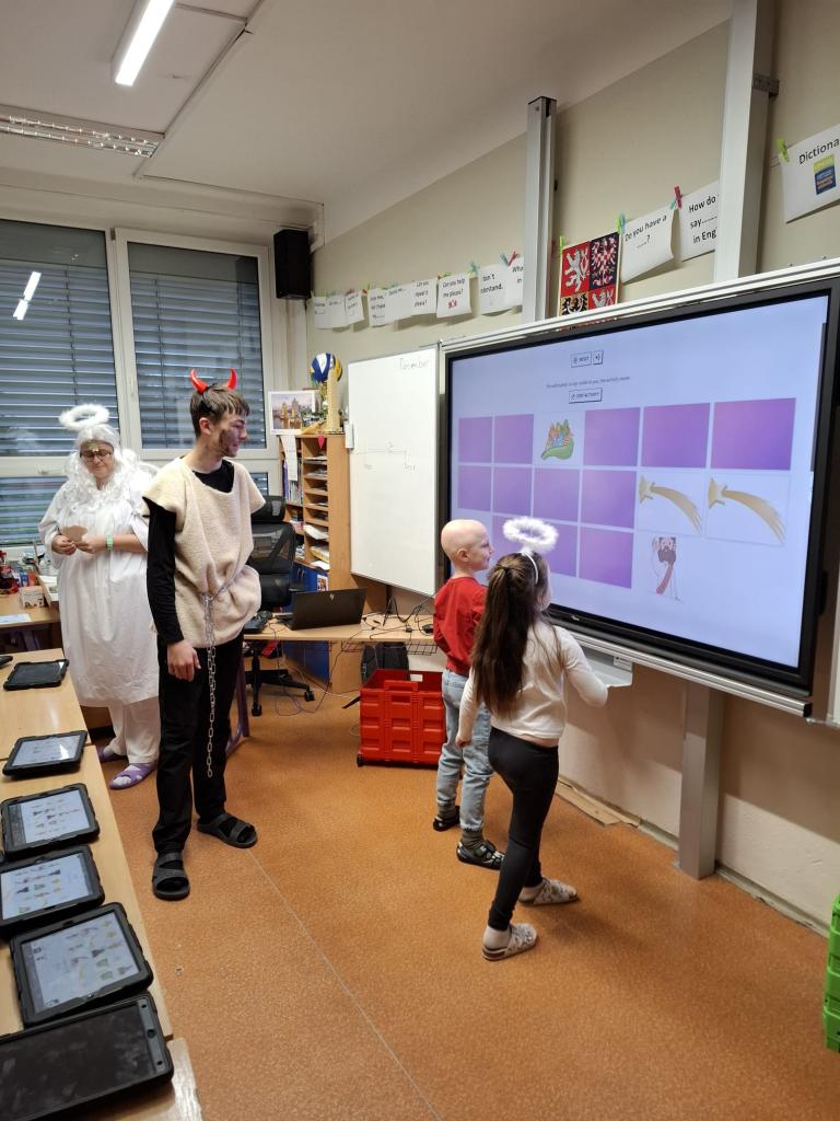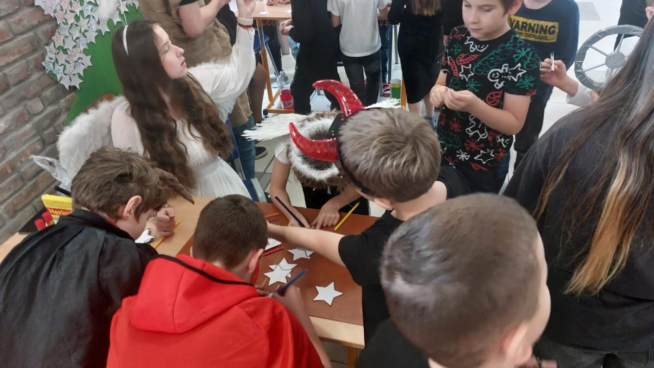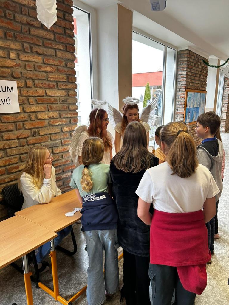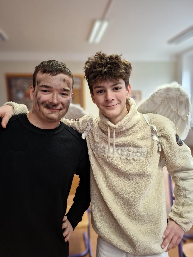 Velkou roli dnes sehráli také naši deváťáci, kteří se ujali rolí čertů a andělů. Nešlo však jen o kostýmy – stali se skutečnými mentory mladších spolužáků. Trpělivě je provázeli jednotlivými stanovišti, pomáhali s úkoly, podporovali je, když si nebyly jisté, a dokázali vytvořit bezpečnou atmosféru, ve které se i ti nejmladší cítili jistě. Jejich obětavost, klid a ochota pomoci byly jedním z nejsilnějších momentů dne.