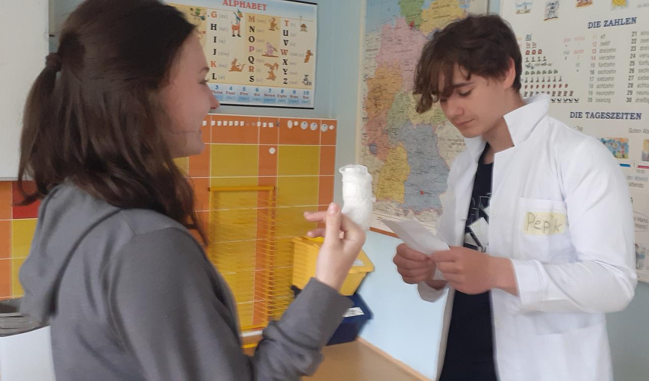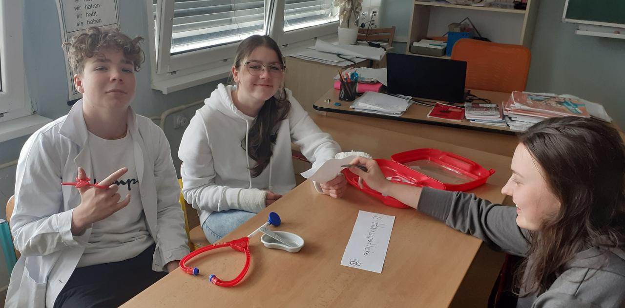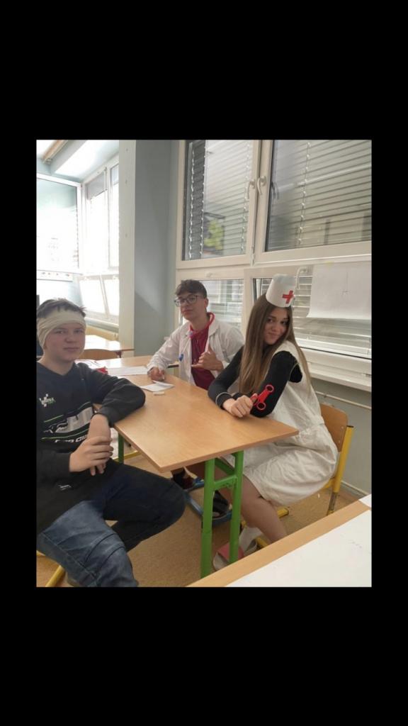 Žáci zinscenovali čekání pacientů v lékárně, práci sestřičky, lékaře a lékárníka. Převlékli se do lékařských uniforem a obvazy označili svá fiktivní zranění. V rozhovorech uplatnili slovní zásobu z vyučovacích hodin.
