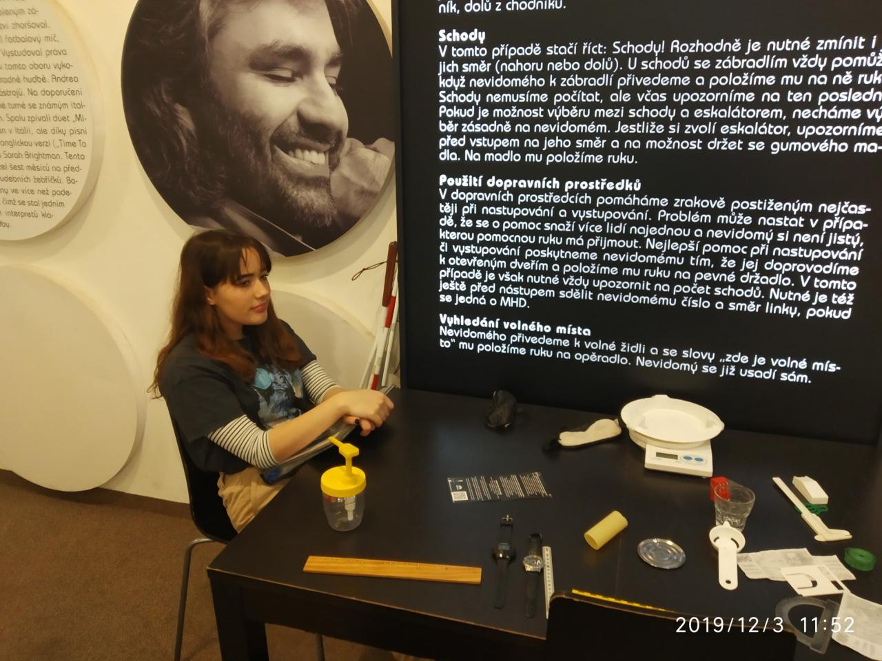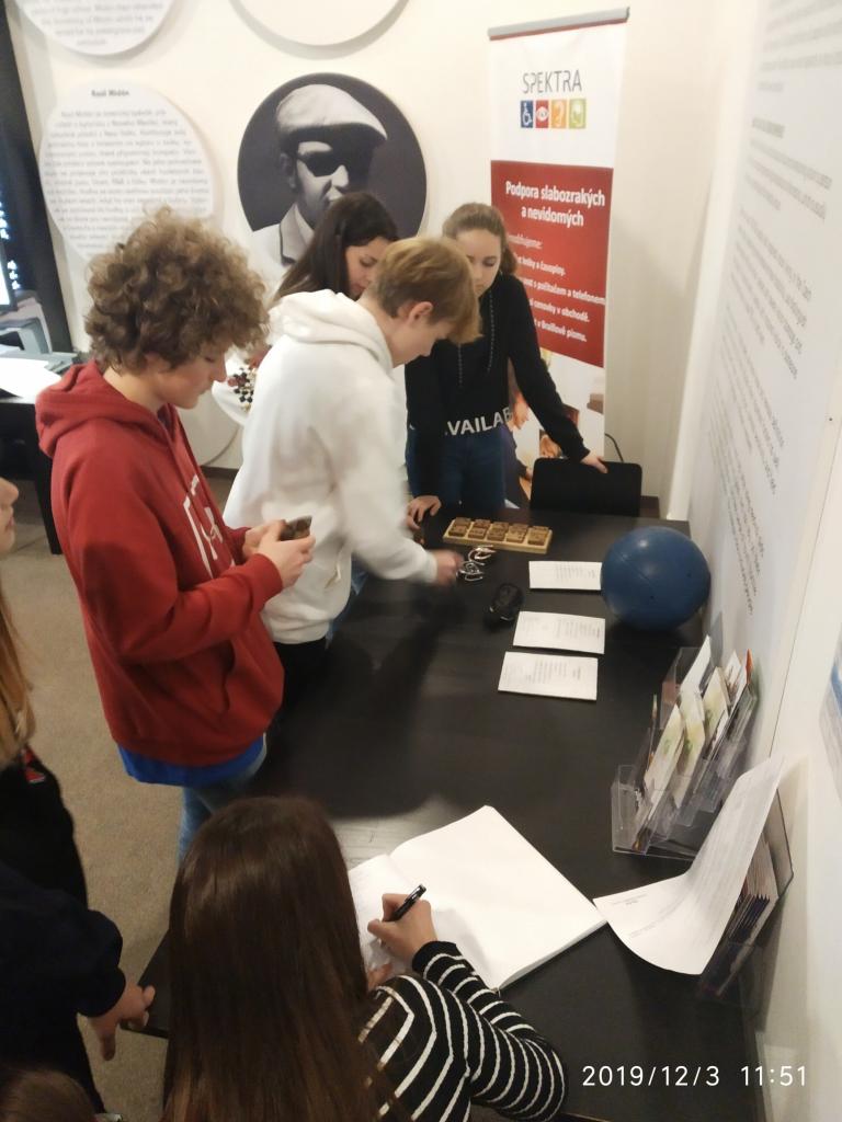 Průvodci jim byli nevidomí lidé, kteří je touto výstavou pustili na hodinu do svého světa. V absolutní tmě žáci prošli nejen bytem, ale i rušnou ulicí, lesem, výstavou soch a celá cesta byla zakončena v kavárně, kde si žáci, jak jinak než v absolutní tmě, objednali pití, za které zaplatili kovovými mincemi, které lze rozeznat díky vroubkům.