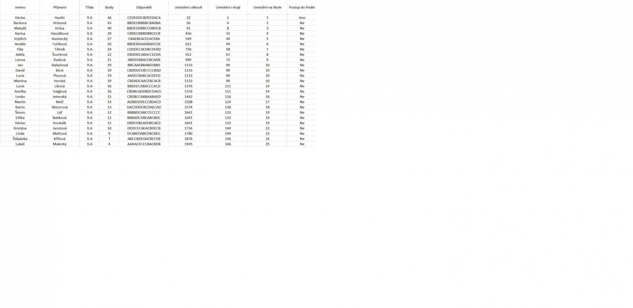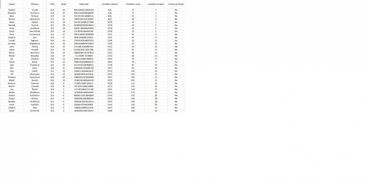 Výsledky všech žáků, kteří se zúčastnili, jsou v přiložených tabulkách. Všichni si zaslouží pochvalu, že se do obtížných úloh pustili, ať už se jim zadařilo více či méně.