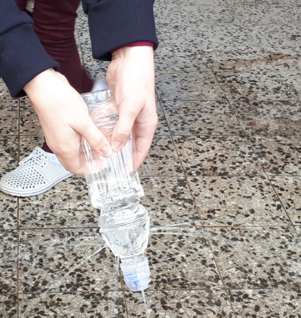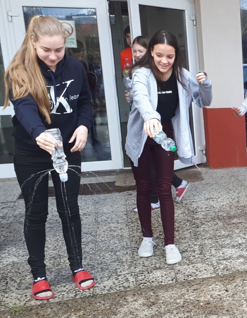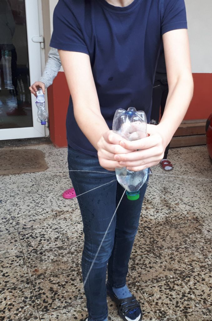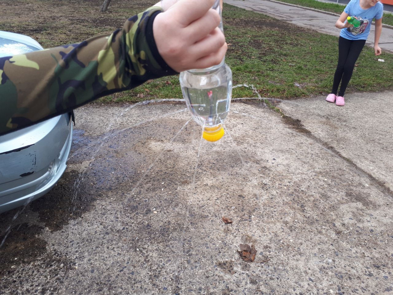 K ověření Pascalova zákona o stejném tlaku ve všech místech kapaliny v uzavřené nádobě použili sedmáci plastové láhve s otvory. Působením jejich síly z otvorů rovnoměrně tryskala voda a tím byl potvrzen stejný tlak v celé kapalině. Pokus byl plný legrace a trocha vody osprchovala snad každého...