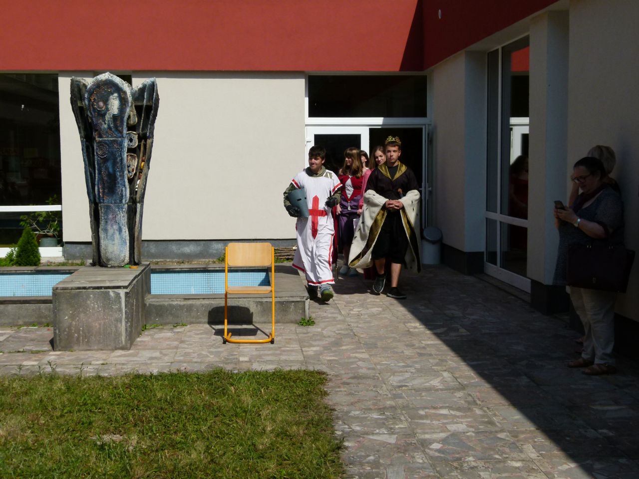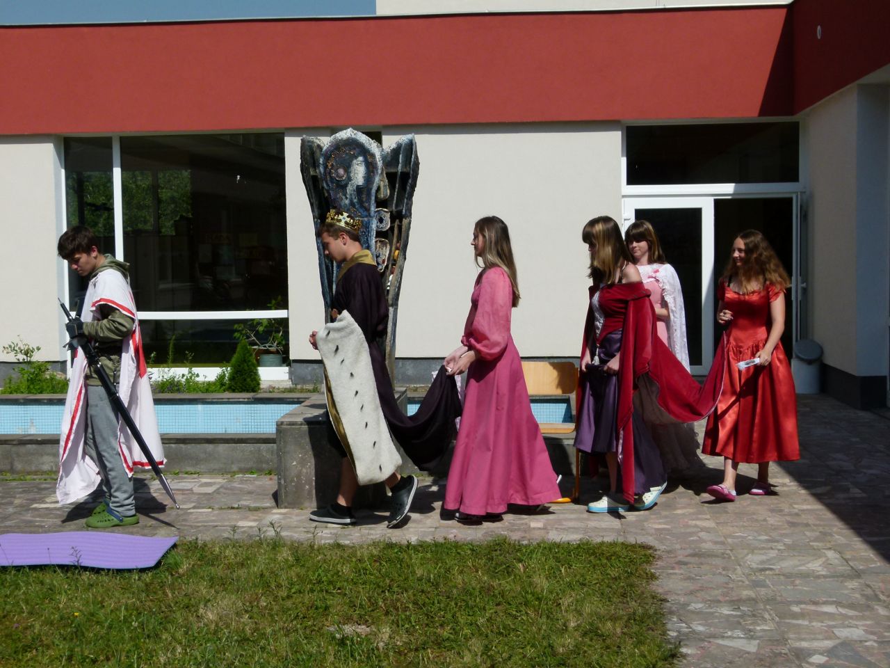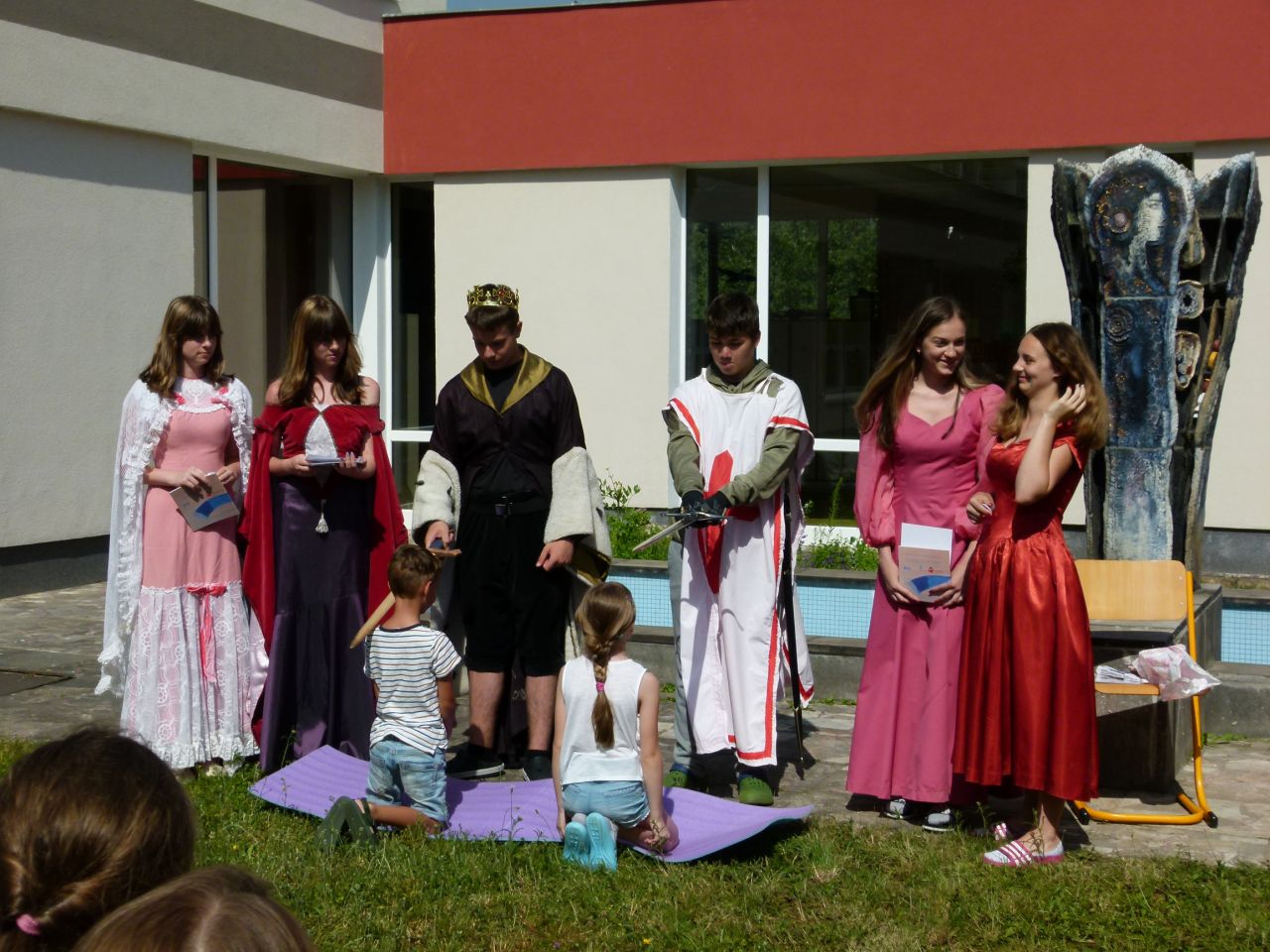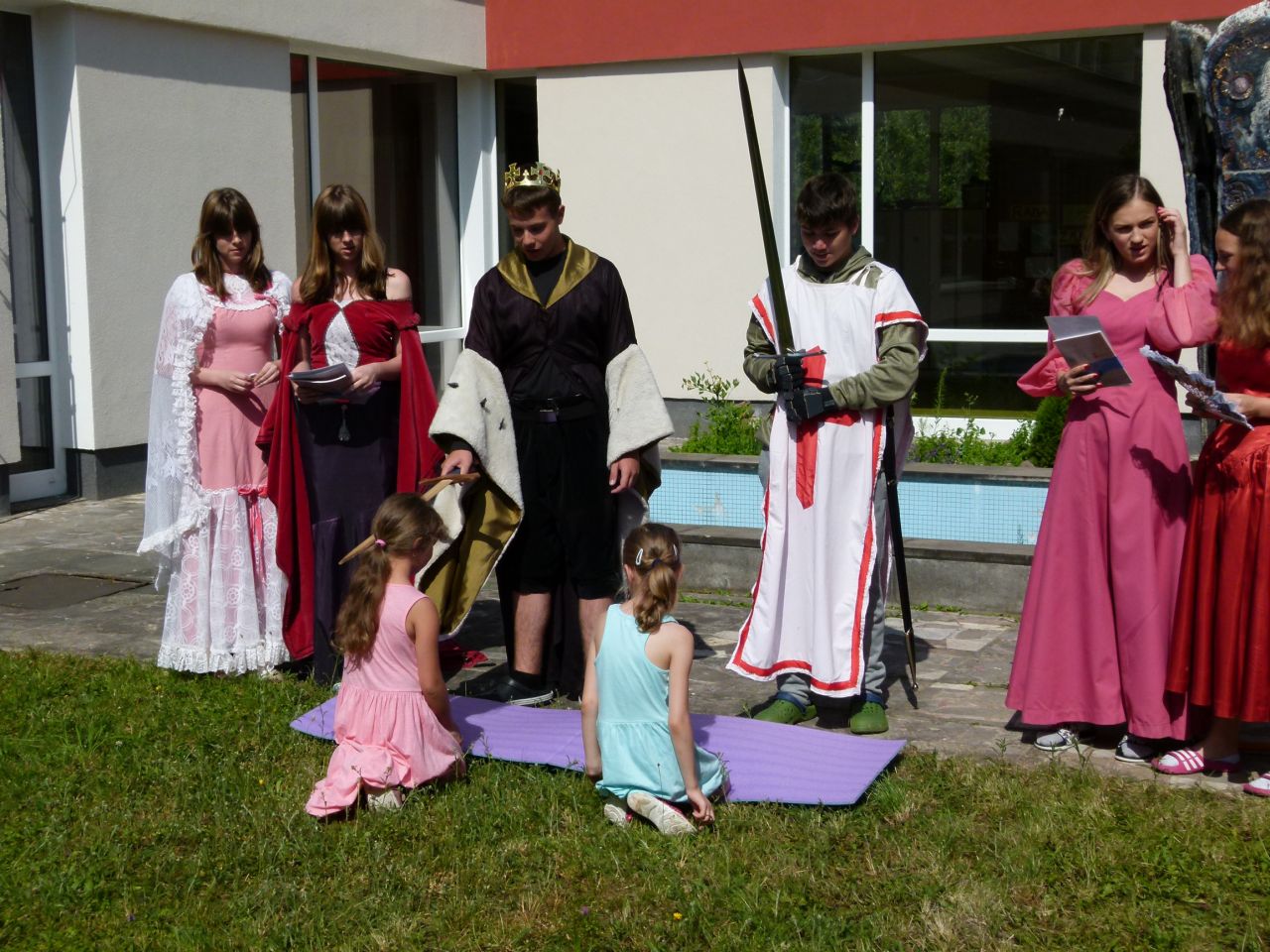 Žáci 9.A se převtělili do krále Oty I. a jeho družiny a přivítali prvňáčky z 1.B v Království čtenářů. Do tohoto království děti putovaly celý školní rok přes Povídálkov, Písmenkov,Moře slabik, Řeku slov a další místa. Protože úspěšně překonaly všechny nástrahy, mohly být slavnostně pasovány na čtenáře.