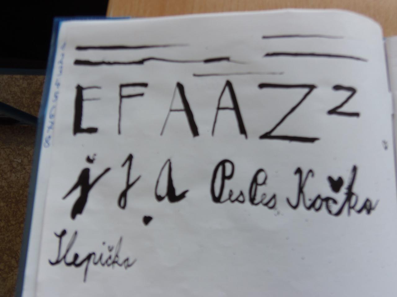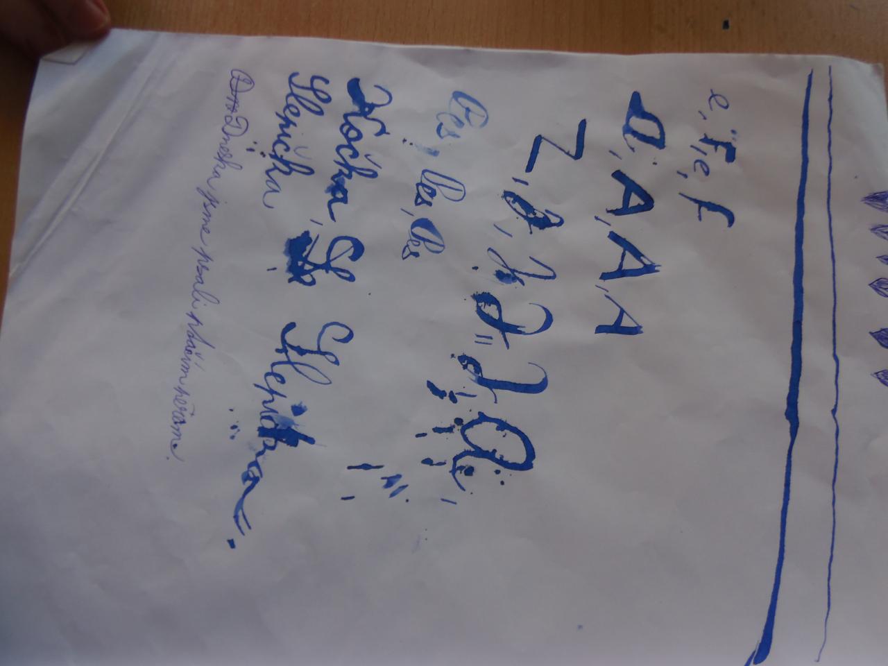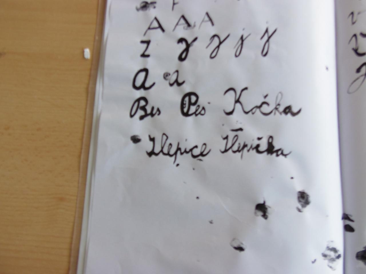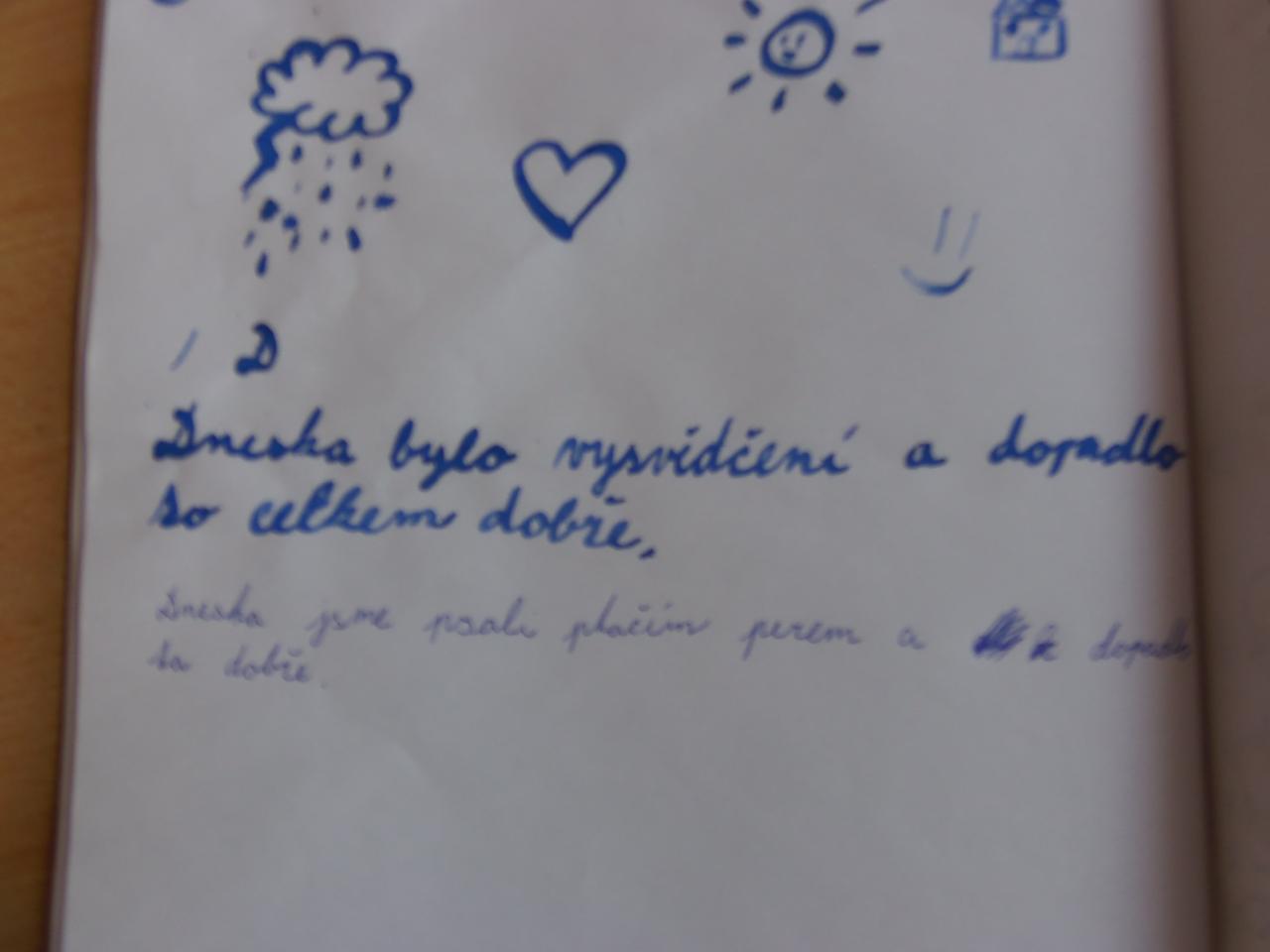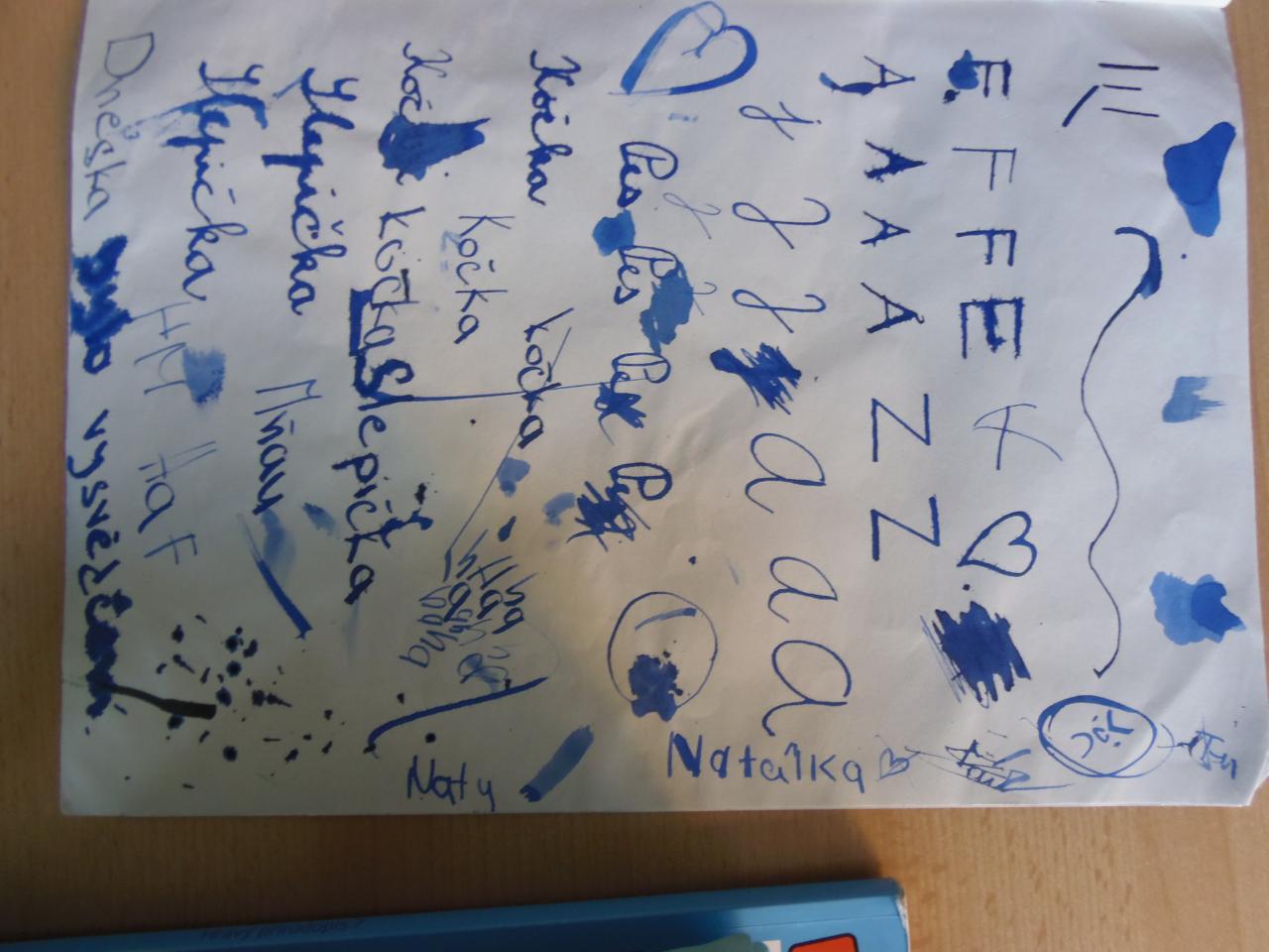 Protože se učíme o ptácích, zkoušeli jsme v hodině biologie psát ptačím peřím. Chtělo to trochu cviku, na závěr spoustu mýdla, ale celkem se nám dařilo