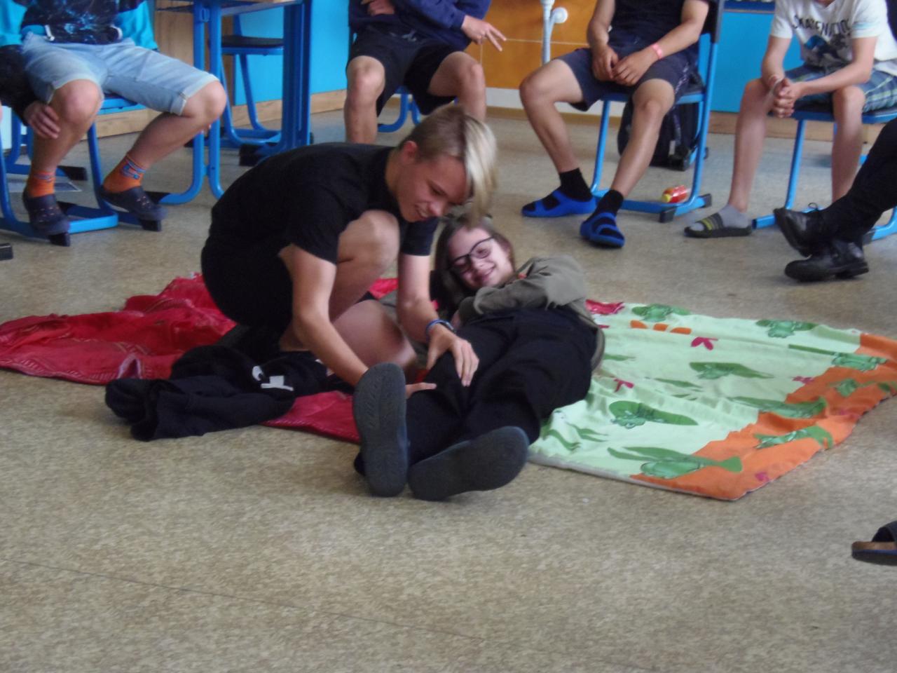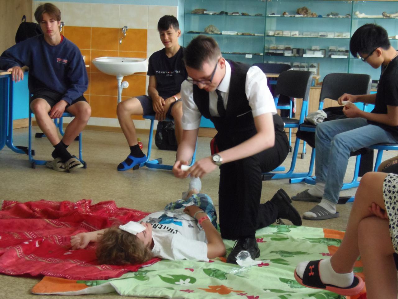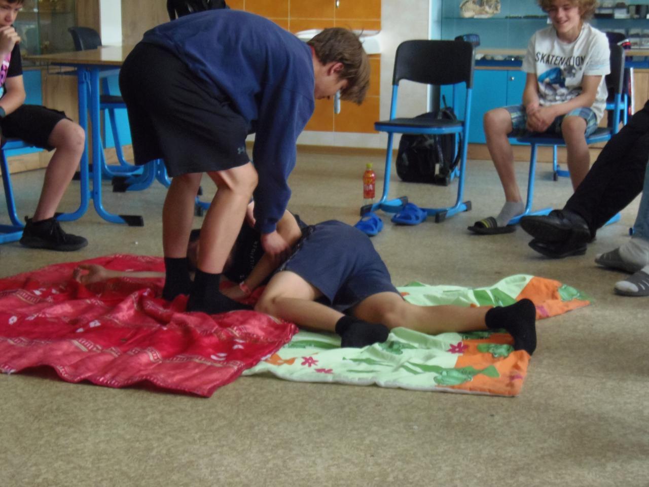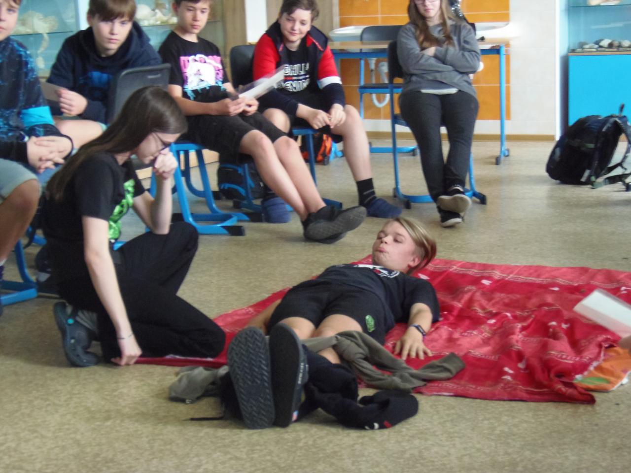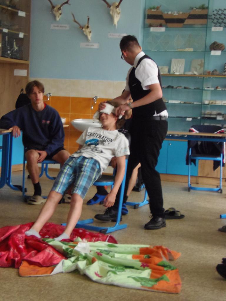 V biologii 8. ročníku se velmi výrazně zaměřujeme na první pomoc při různých úrazech a nehodách. Abychom neproplouvali jen teorií, zkoušíme to i prakticky, správně ošetřujeme zranění, jako figuranti nám slouží spolužáci