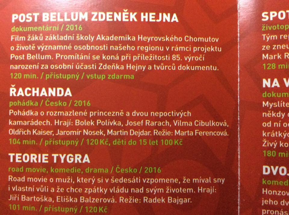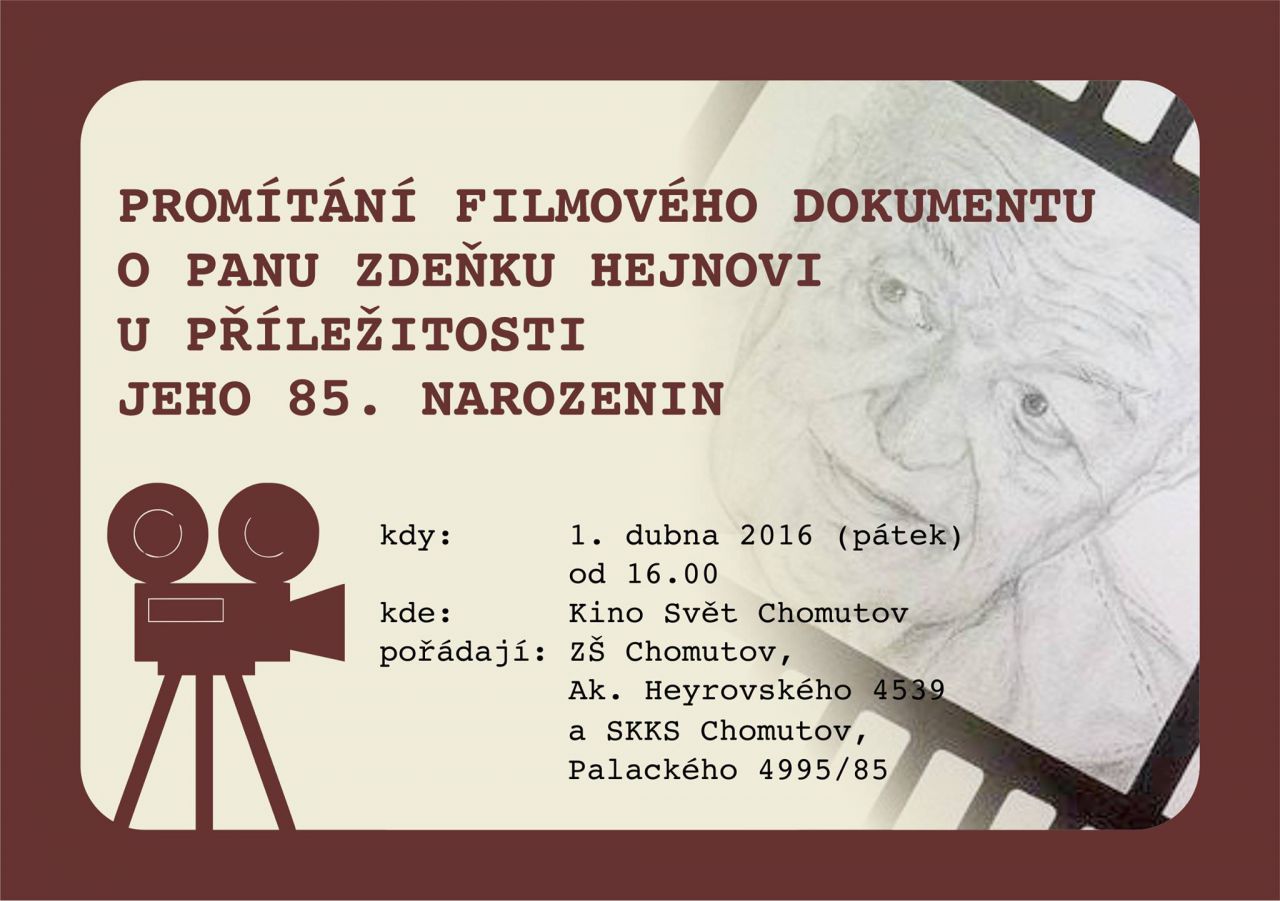 Dne 1. dubna 2016 byl aprílový pátek. Děti v ZŠ Chomutov, Ak. Heyrovského si dopoledne užili spolu s učiteli několika aprílových žertíků, odpoledne však bylo reálné, vzpomínkové, úsměvné, upřímné, dojemné a hlavně – filmové. Tým žáků ve složení Klárka Halejová, Adélka Kráková, Terka Mistolerováa Jakub Toth za podpory učitelů Blanky Legnerové a Emila Zahálky představil v kině Svět Chomutov premiéru žákovského dokumentárního filmu Zdeněk Hejna. Tento tým se na začátku školního roku přihlásil do projektu Příběhy našich sousedů, který připravila organizace Post Bellum. Jejím cílem je vytvořit celonárodní archív Paměť národa zachycující vzpomínky významných osobností z jednotlivých regionů formou rozhlasových nahrávek, prezentací, filmů, vše s pomocí žáků základních škol. Děti se tak mohou setkávat s pamětníky, povídat si s nimi, dozvídat se zajímavé příběhy, podívat se na minulost z jiné stránky, než jsou zvyklí ve škole.