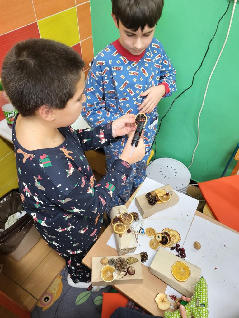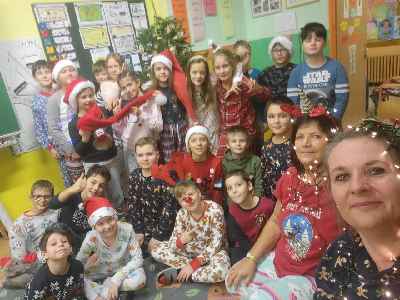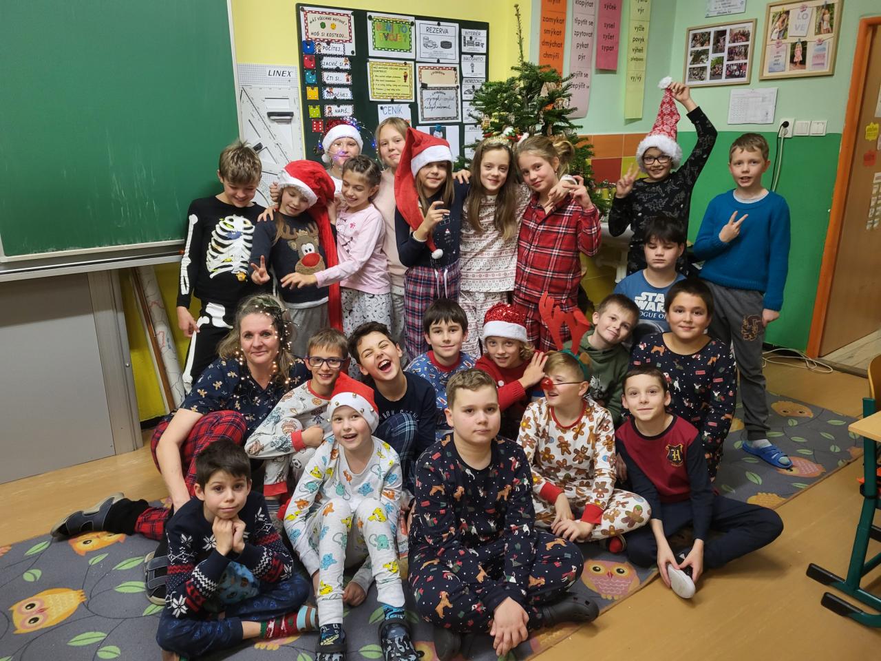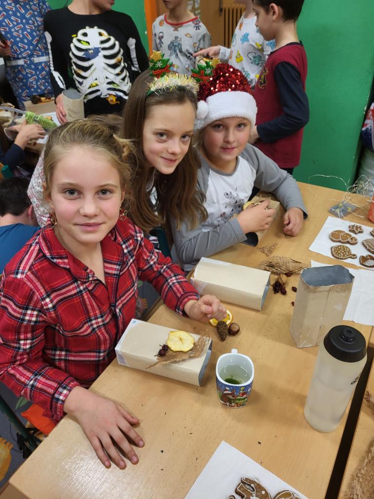 Večer se sešly s paní učitelkou a s paní asistentkou na vánočním přenocování, které bylo plné zábavy. Nejprve si děti namalovaly perníčky, kterými následně ozdobily jedličku a rozvoněly tím celou třídu. Nechyběl ani zpěv při kytaře a klavíru, který nám navodil příjemnou vánoční atmosféru. O hry a tvoření nebyla nouze. Večerní usínání nám oživil tematicky laděný film.