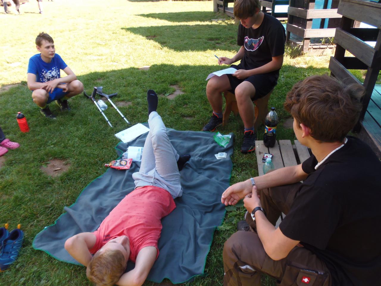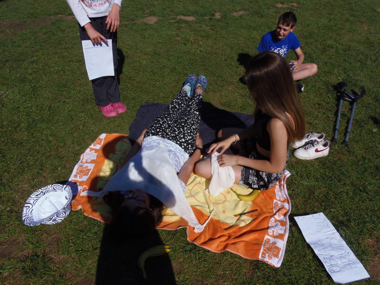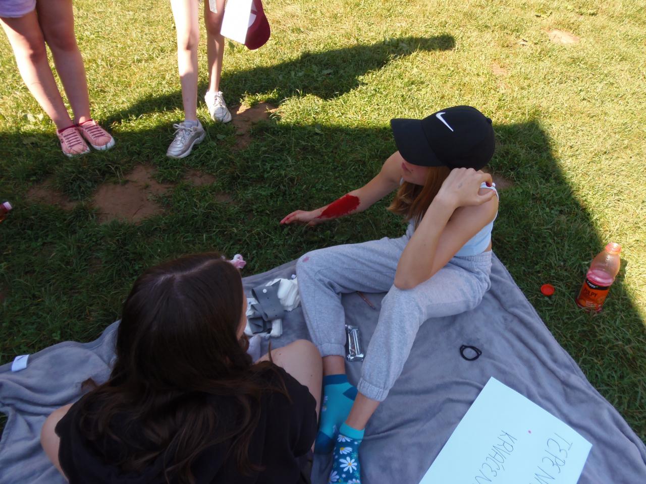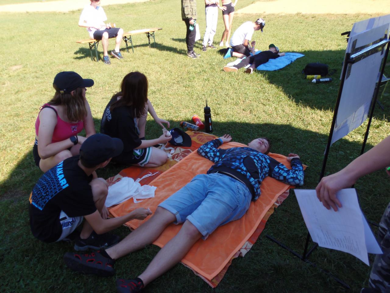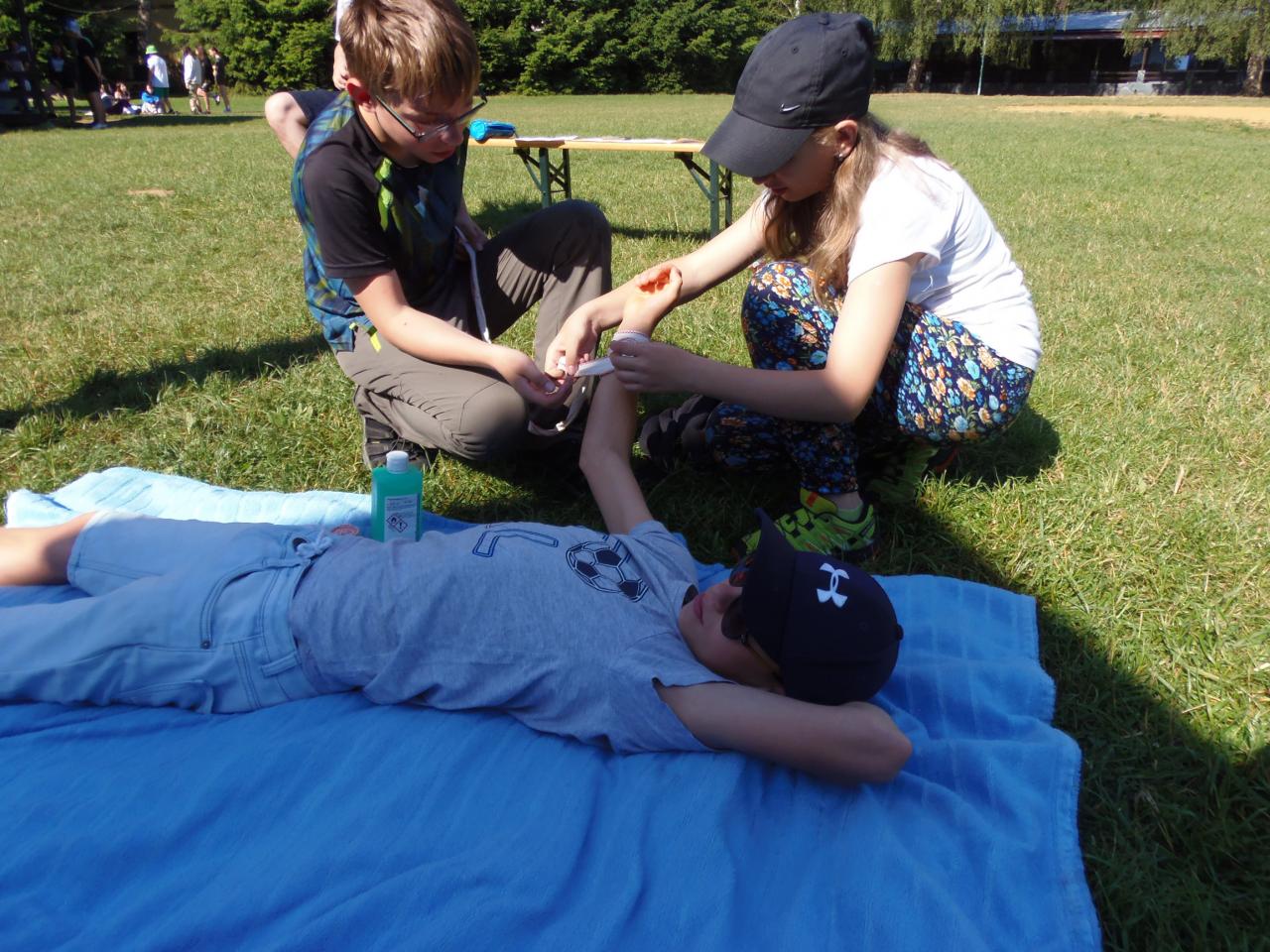 V sobotu 11.6. se konal Den první pomoci. Osmáci a deváťáci si pro mladší spolužáky připravili 30 stanovišť s různými druhy poranění, kde vysvětlovali, jak ke zranění může dojít, jak mu předcházet, a když už k němu dojde, tak to nejdůležitější - jak zranění ošetřit. Učili své spolužáky základům první pomoci. Když všechno vysvětlili a zodpověděli na otázky skupin šesťáků a sedmáků, role se obrátily a mladší děti předvedly, co se naučily. Starší žáci je hodnotili na každém stanovišti 10 body.