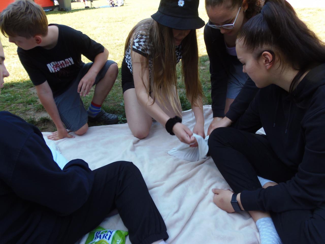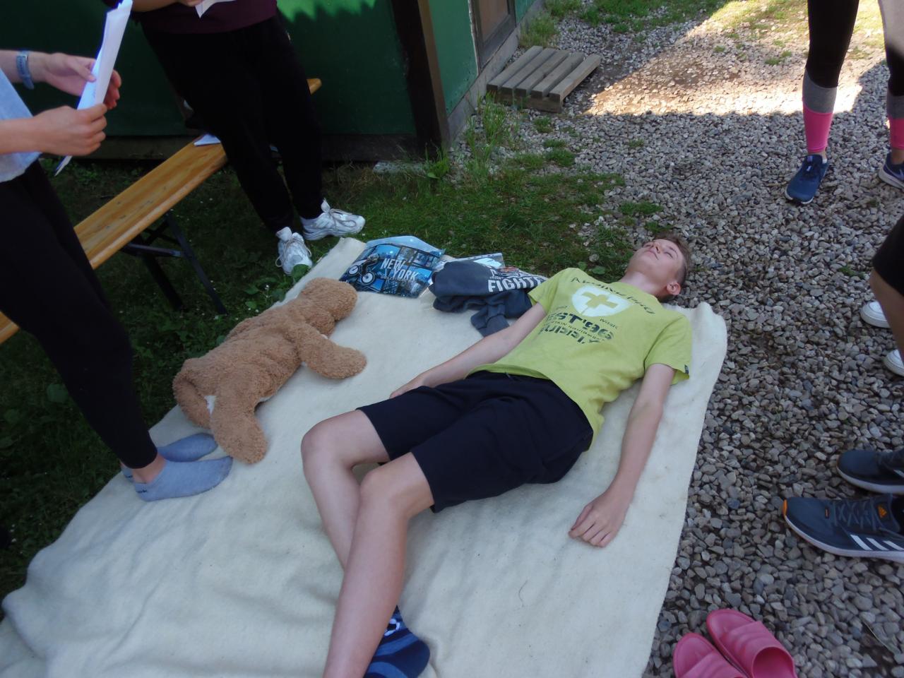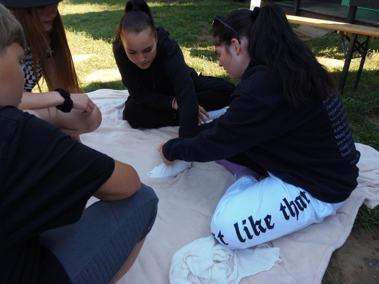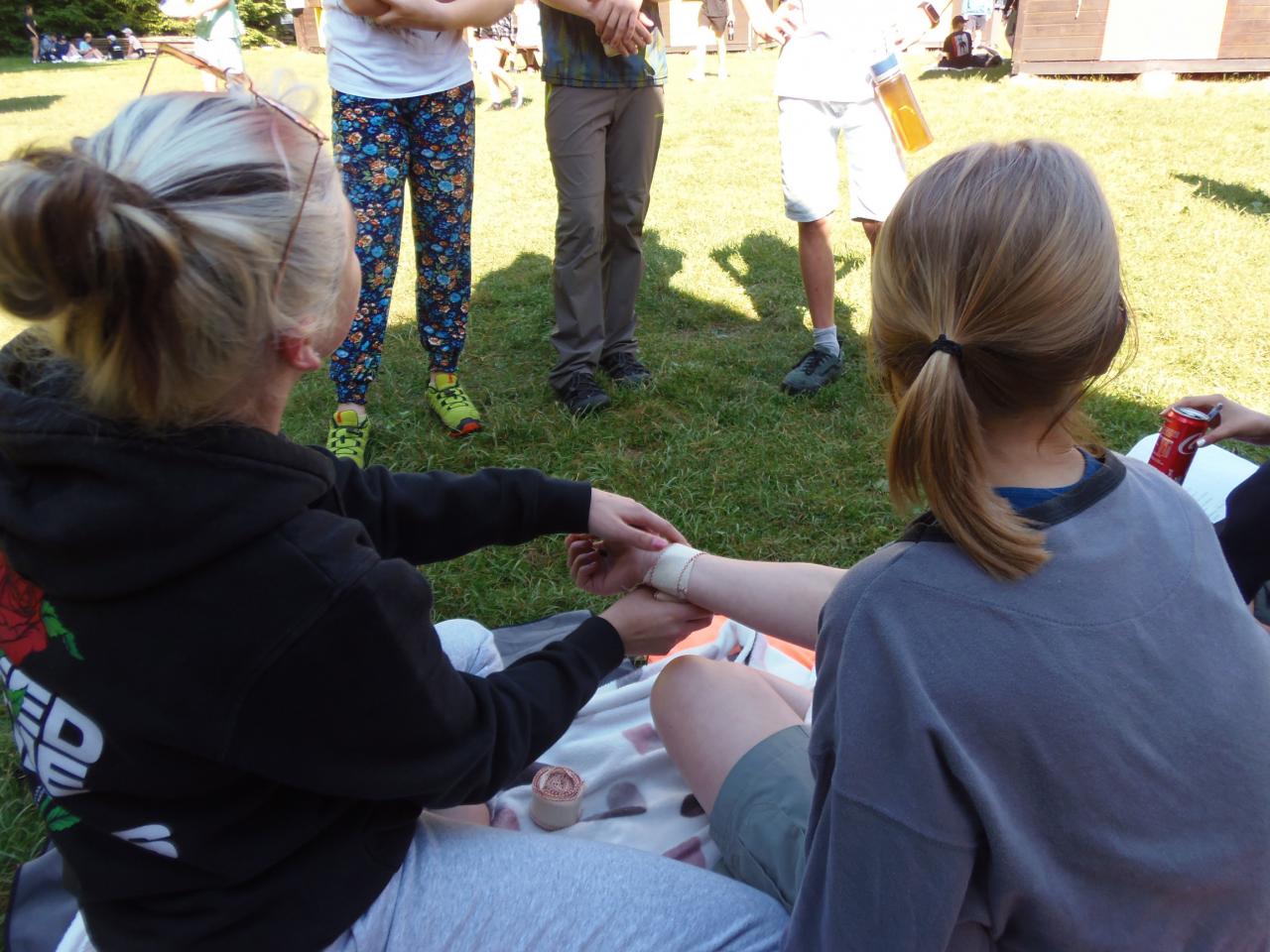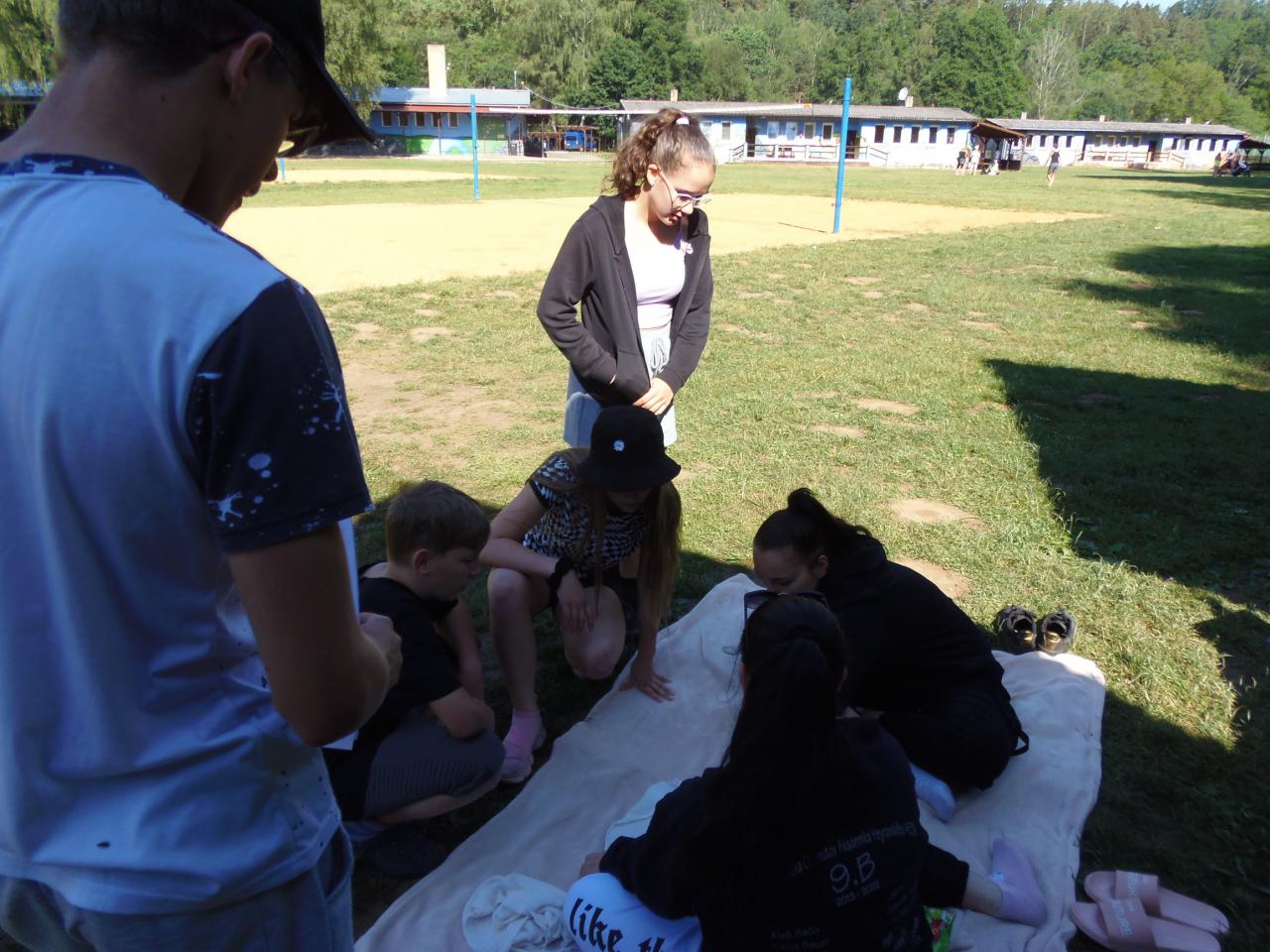 V sobotu 11.6. se konal Den první pomoci. Osmáci a deváťáci si pro mladší spolužáky připravili 30 stanovišť s různými druhy poranění, kde vysvětlovali, jak ke zranění může dojít, jak mu předcházet, a když už k němu dojde, tak to nejdůležitější - jak zranění ošetřit. Učili své spolužáky základům první pomoci. Když všechno vysvětlili a zodpověděli na otázky skupin šesťáků a sedmáků, role se obrátily a mladší děti předvedly, co se naučily. Starší žáci je hodnotili na každém stanovišti 10 body.