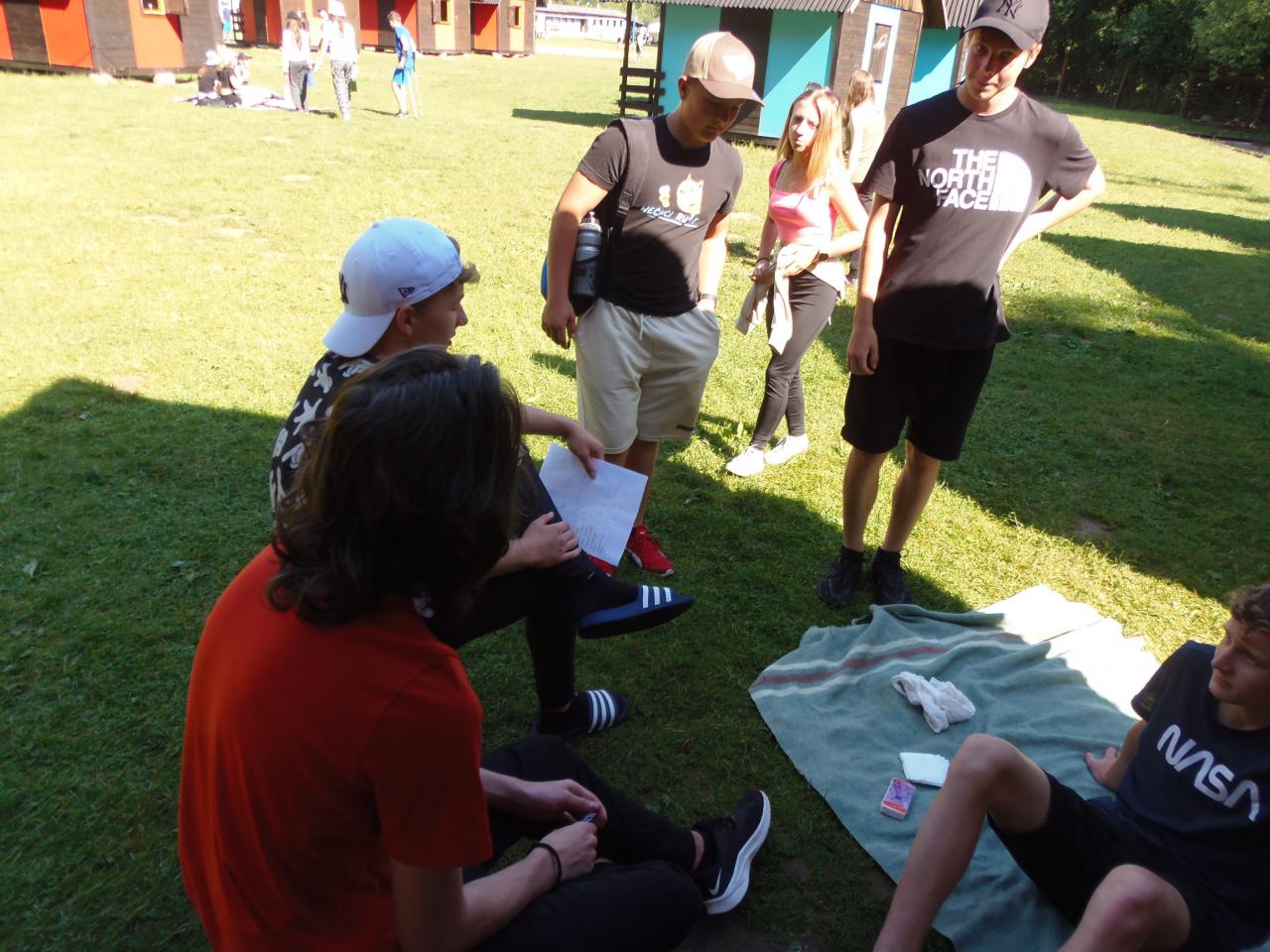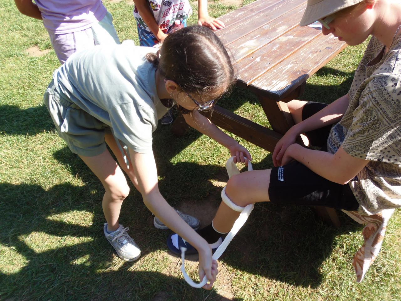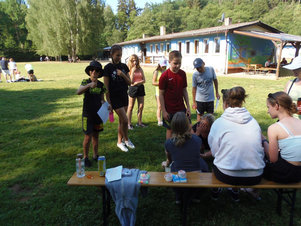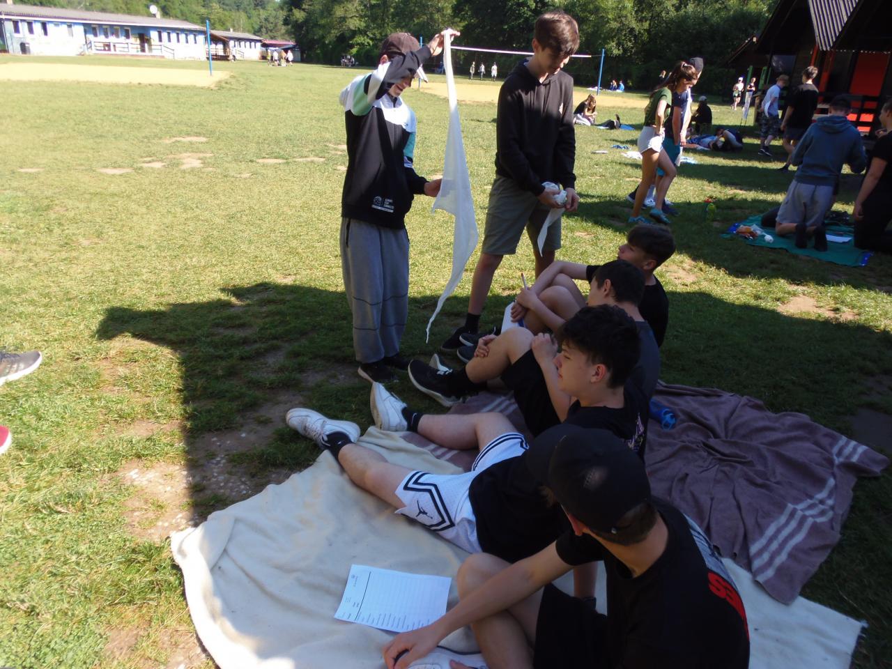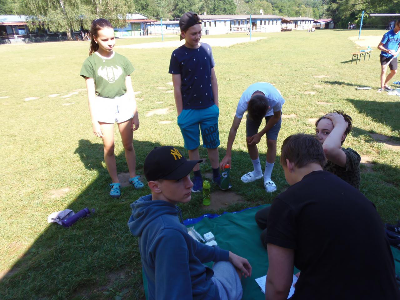 V sobotu 11.6. se konal Den první pomoci. Osmáci a deváťáci si pro mladší spolužáky připravili 30 stanovišť s různými druhy poranění, kde vysvětlovali, jak ke zranění může dojít, jak mu předcházet, a když už k němu dojde, tak to nejdůležitější - jak zranění ošetřit. Učili své spolužáky základům první pomoci. Když všechno vysvětlili a zodpověděli na otázky skupin šesťáků a sedmáků, role se obrátily a mladší děti předvedly, co se naučily. Starší žáci je hodnotili na každém stanovišti 10 body.