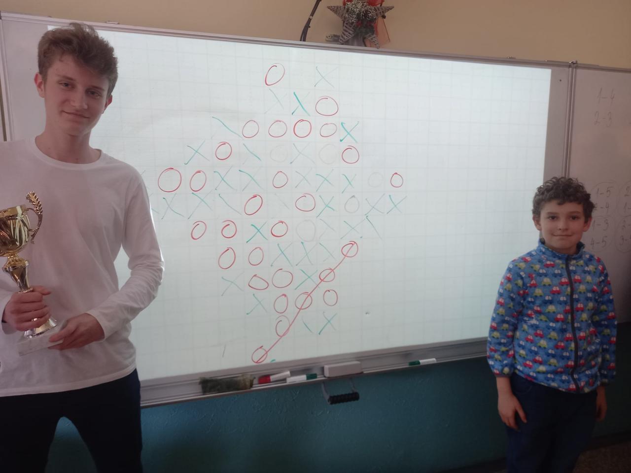 Po zápasech v šestičlenných skupinách už šlo do tuhého a odehrály se zápasy o umístění, v nichž si mezi mladšími nejlépe vedl Marek Pravda ze 4.B a mezi staršími Štěpán Juran z 9.B. A právě mezi nimi se uskutečnila závěrečná bitva na tabuli před zraky všech soutěžících o ABSOLUTNÍHO VÍTĚZE. Tím se po velkém boji nakonec stal Štěpán Juran, který se na rok stal držitelem putovního poháru GRATULUJEME